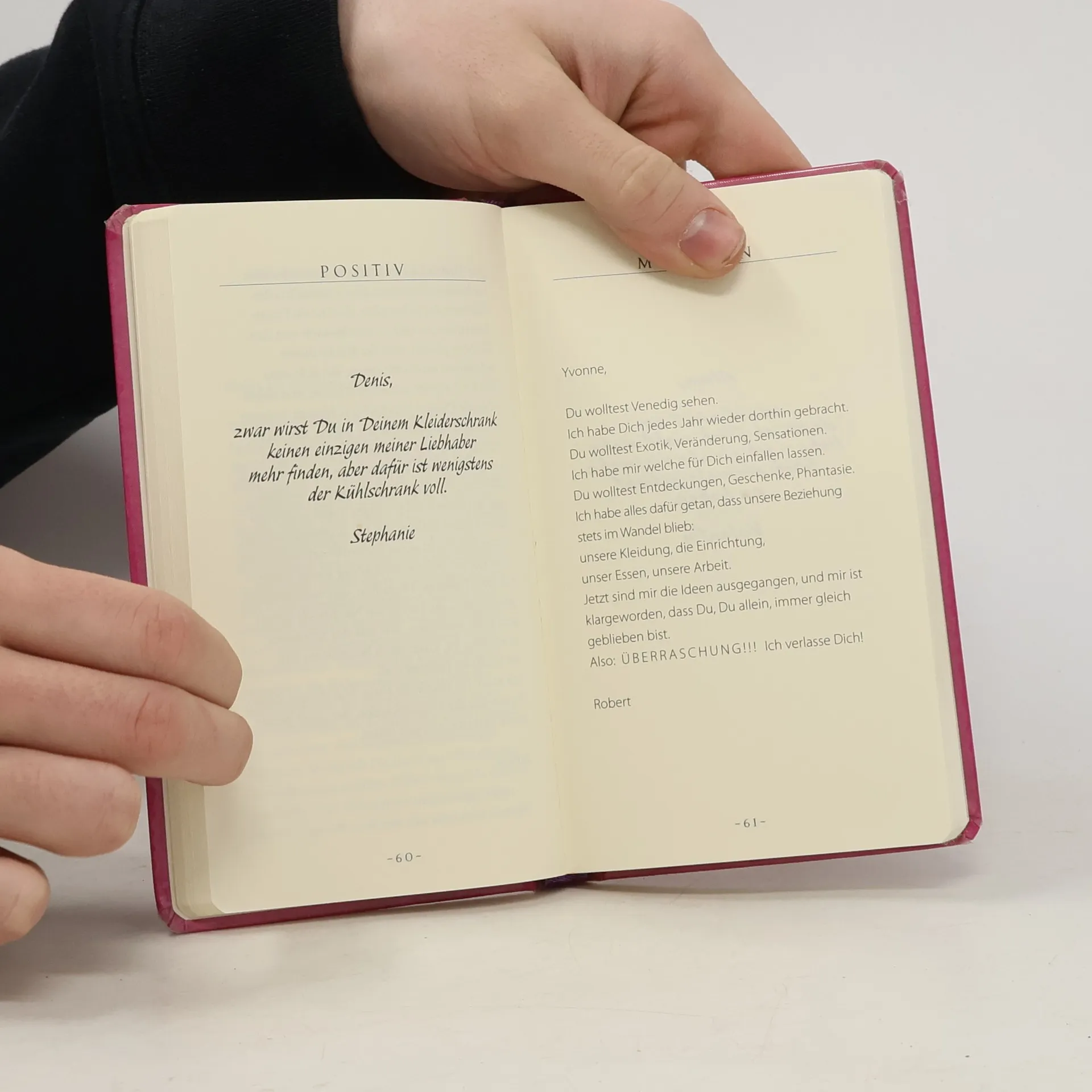 Dieses Buch bietet eine Vielzahl von Abschiedsbotschaften für jede Art von Trennung, von kurzen Sätzen bis hin zu langen Erklärungen. Die Botschaften sind humorvoll und reichen von fürsorglich bis grausam, und bieten amüsante Auswege aus Beziehungsdesastern.