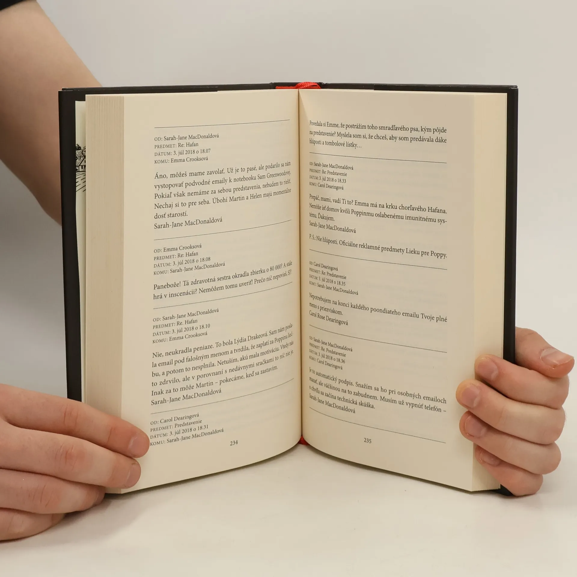 Hlavní aktéri miestneho divadelného združenia sa dozvedia zdrvujúcu správu. Ich vnučka má rakovinu. Členovia divadelného spolku zorganizujú finančnú zbierku, no vzápätí sa vynárajú pochybnosti o dobrom úmysle niektorých z jej organizátorov. Spor vyvrcholí vraždou, podozrivý je zatknutý a čaká na súd. Autorka poskytuje čitateľovi možnosť zapojiť sa do práce dvojice právnikov a pomocou e-mailov a správ, ktoré sú hlavným nosičom deja, odhaliť, kto je skutočným vrahom.