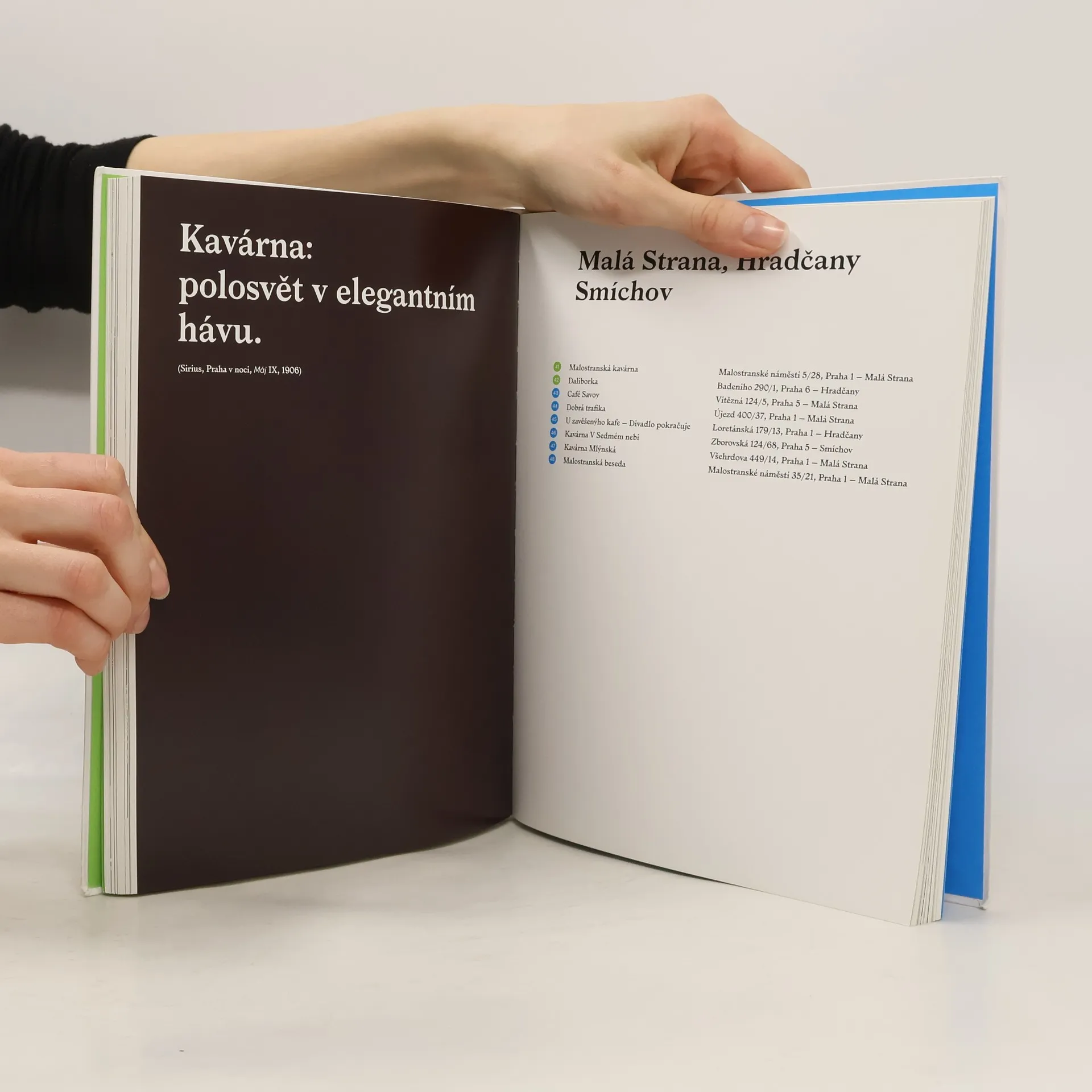 Kavárenská tradice je v Čechách stará více než tři sta let. Nedílně patří k formování života a kultury české společnosti. V kavárnách se zakládala umělecká hnutí a spolky, kavárenský život obohatil literaturu, divadlo i politiku. Kavárny navštěvovali Franz Kafka, Milena Jesenská, Jan Zrzavý, Adolf Hoffmeister i Václav Havel. Kavárny jsou svědky doby, odráží se v nich dobový vkus i atmosféra. Putování po historii počínající rokem 1713 mapuje historii národa, architektury a umění. Kniha představuje současnost na vrstvách minulosti. Pátrá po zaniklých podnicích, z nichž nám zůstaly jen vzpomínky či nenápadné stopy, připomíná dlouhou historii stálic kavárenského nebe a objevuje nová zajímavá místa.