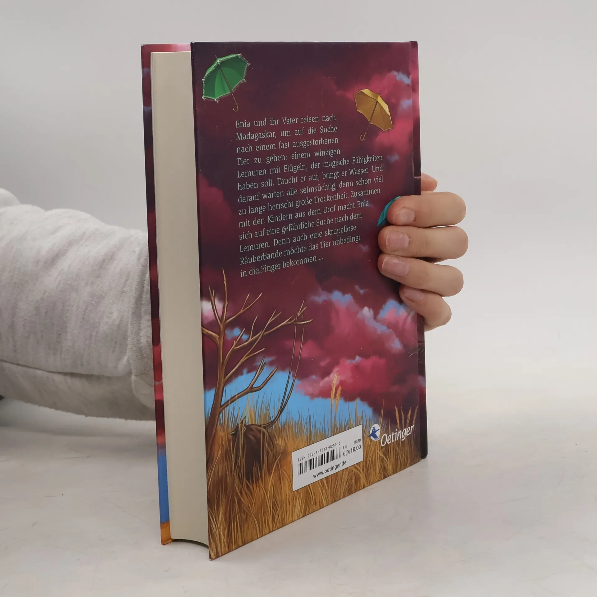 In "Auf der Suche nach dem Regenmacher" reisen die 11-jährige Enia und ihr Vater nach Madagaskar, um einen magischen, als ausgestorben geltenden Lemuren zu finden, der Wasser finden kann. Gemeinsam mit Dorfbewohnern und Kindern erleben sie ein Abenteuer gegen eine skrupellose Räuberbande. Das Buch thematisiert Freundschaft, Zusammenhalt und die Folgen des Klimawandels.