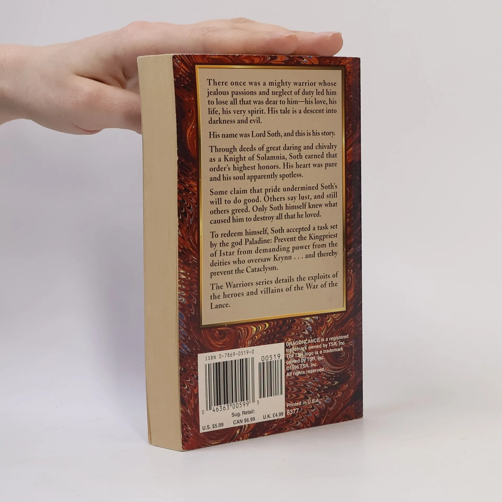 There once was a mighty warrior whose jealous passions and neglect of duty led him to lose all that was dear to him--his love, his life, his very spirit. His tale is a descent into darkness and evil.His name was Lord Soth, and this is his story.Through deeds of great daring and chivalry as a Knight of Solamnia, Soth earned that order's highest honors. His heart was pure and his soul apparently spotless.Some claim that pride undermined Soth's will to do good. Others say lust, and still others greed. Only Soth himself knew what caused him to destroy all that he loved.To redeem himself, Soth accepted a task set by the god Paladine: Prevent the Kingpriest of Istar from demanding power from the deities who oversaw Krynn...and thereby prevent the Cataclysm.