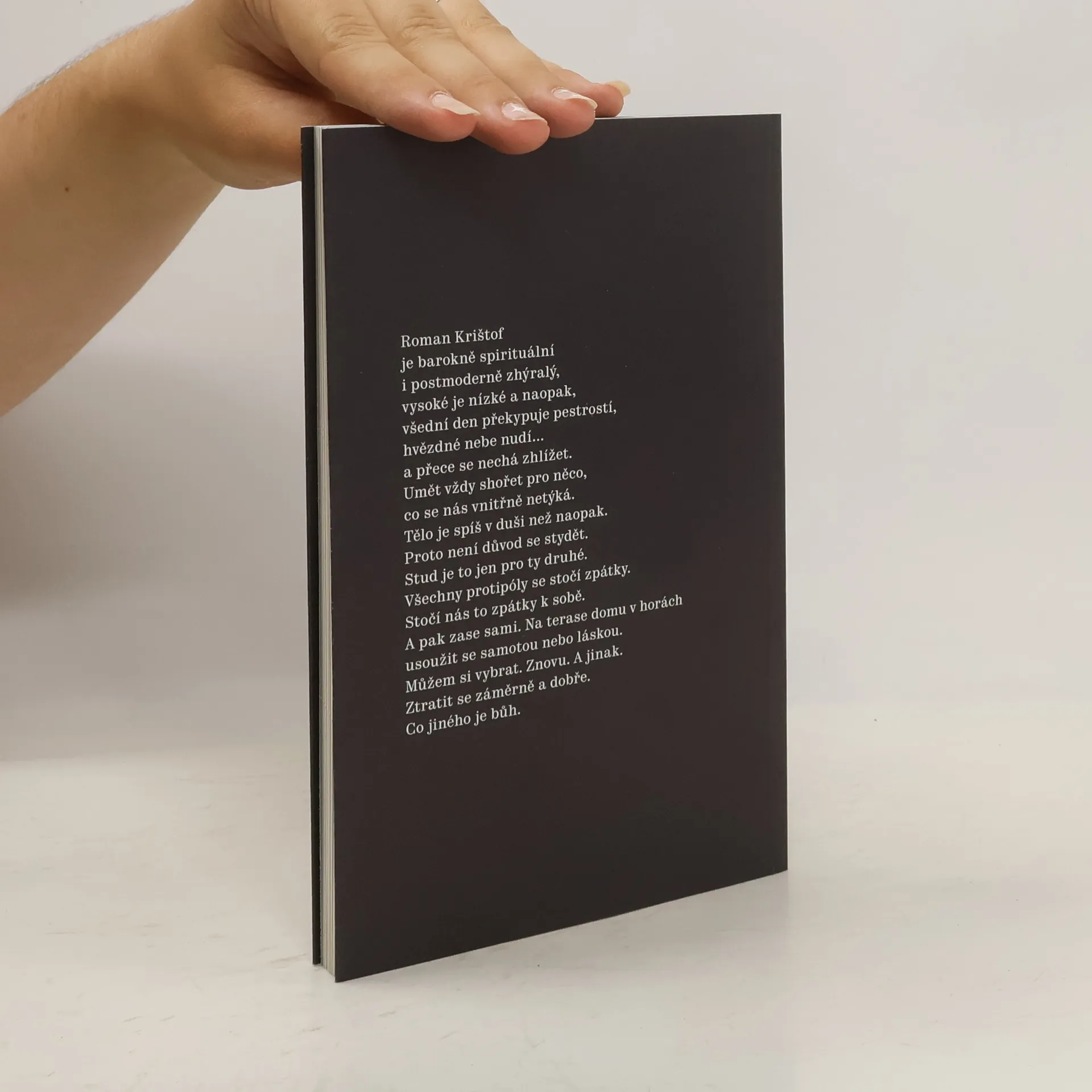 Roman Krištof je spirituální i postmoderně zhýralý, vysoké je nízké a naopak, všední den překypuje pestrostí, hvězdné nebe nudí... a přece se nechá zhlížet. Umět vždy shořet pro něco, co se nás vnitřně netýká. Tělo je spíš v duši než naopak. Proto není důvod se stydět. Stud jeto jen pro ty druhé. Všechny protipóly se stočí zpátky. Stočí nás to zpátky k sobě. A pak zase sami. Na terase domu v horách usoužit se samotou, nebo láskou. Můžem si vybrat. Znovu. A jinak. Ztratit se záměrně a dobře. Co jiného je bůh.