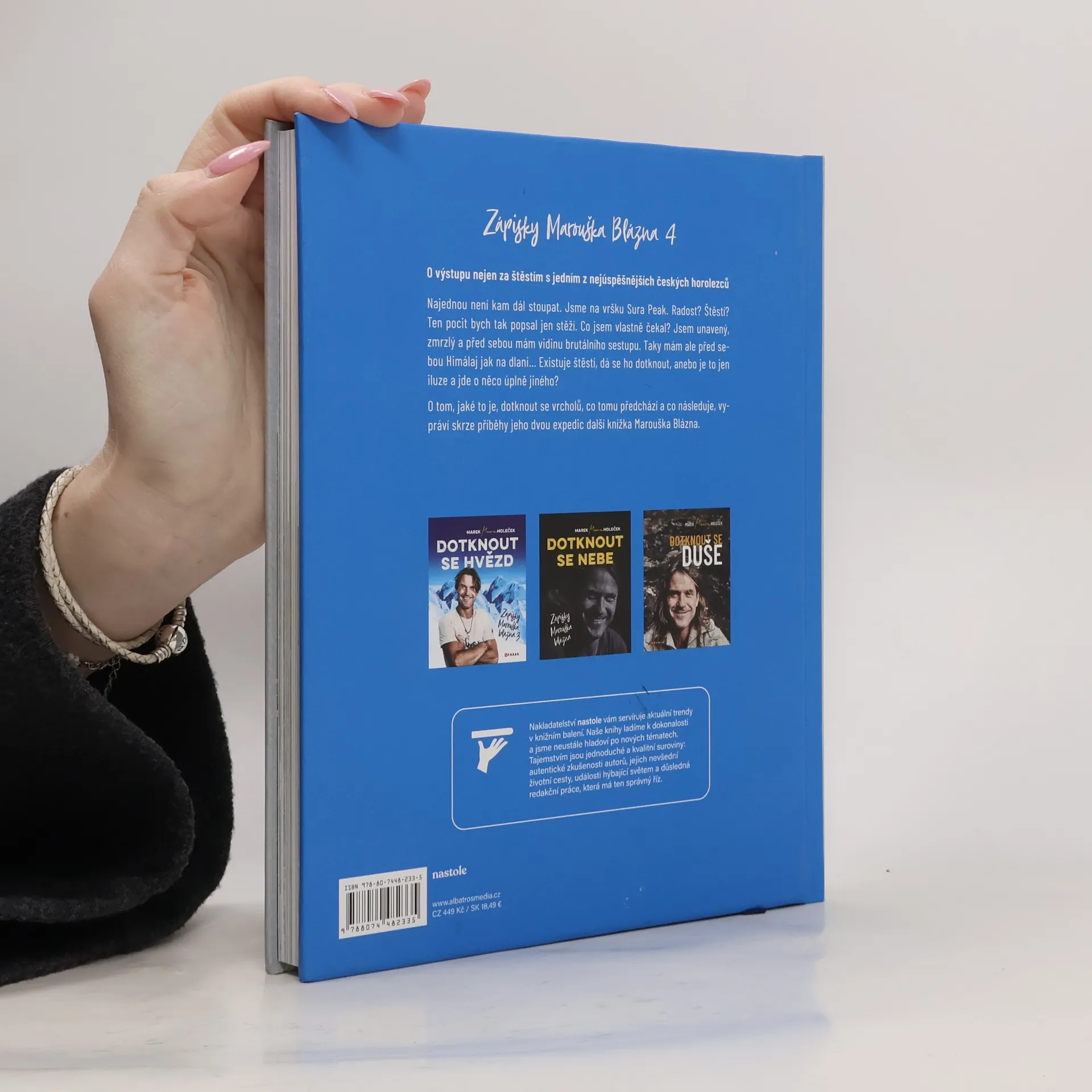 Najednou není kam dál stoupat. Jsme na vršku Sura Peak. Radost? Štěstí? Ten pocit bych tak popsal jen stěží. Co jsem vlastně čekal? Jsem unavený, zmrzlý a před sobou vidinu brutálního sestupu. Taky mám ale před sebou Himálaj jak na dlani… Existuje štěstí, dá se ho dotknout, anebo je to jen iluze a jde o něco úplně jiného? O tom, jaké to je, dotknout se vrcholů, co tomu předchází a co následuje, vypráví skrze příběhy jeho dvou expedic další knížka Marouška Blázna.