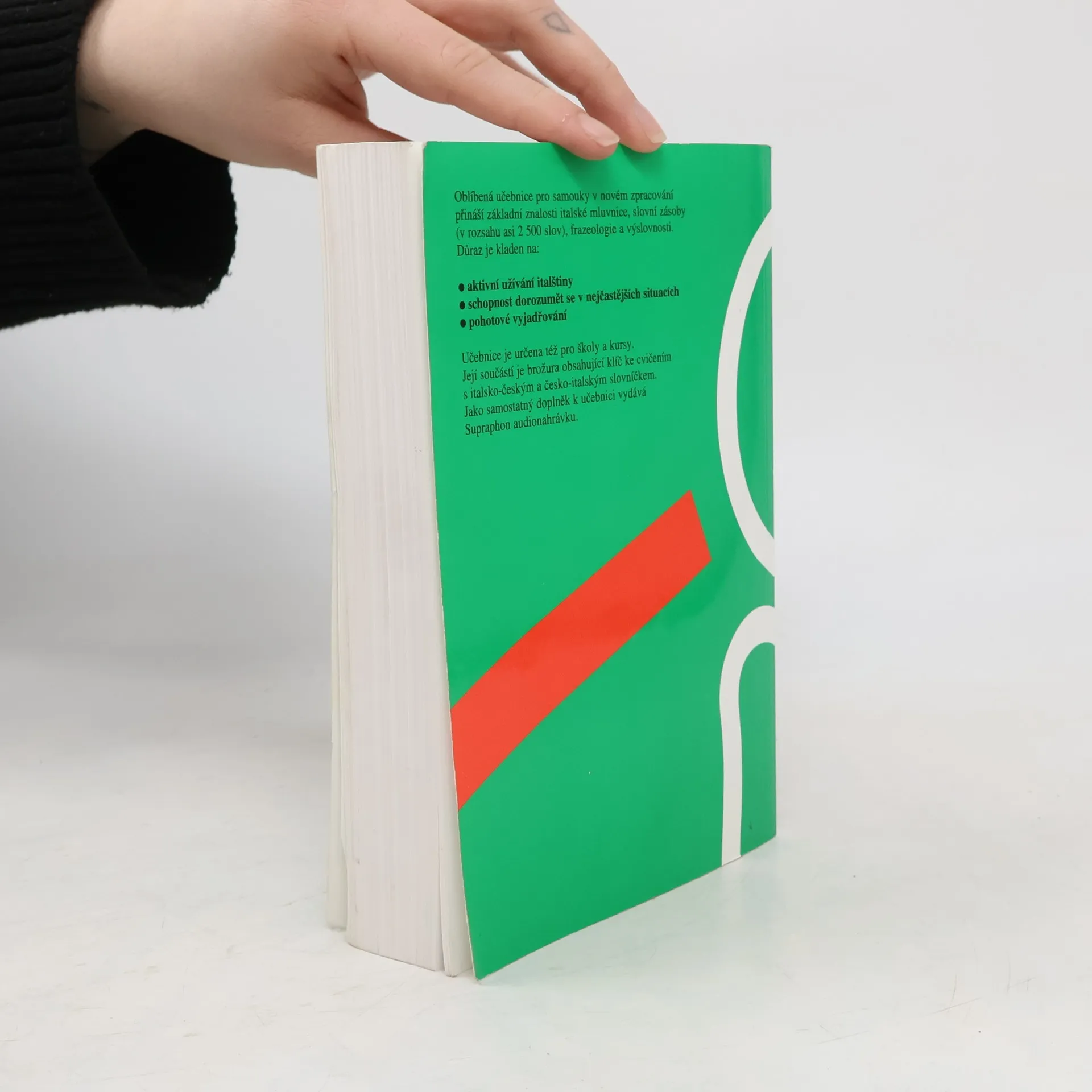 Oblíbená učebnice pro samouky v novém zpracování přináší základní znalosti italské mluvnice, slovní zásoby (v rozsahu asi 2500 slov ), frazeologie a výslovnosti. Důraz je kladen na: aktivní užívání italštiny schopnost dorozumět se v nejčastějších situacích pohotové vyjádřováníUčebnice je určena též pro školy a kursy. Její součásti je brožura obsahující klíč ke cvičením s italsko-českým a česko-italským slovníčkem. Jako samostatný doplněk vydává Supraphon audionahrávku.