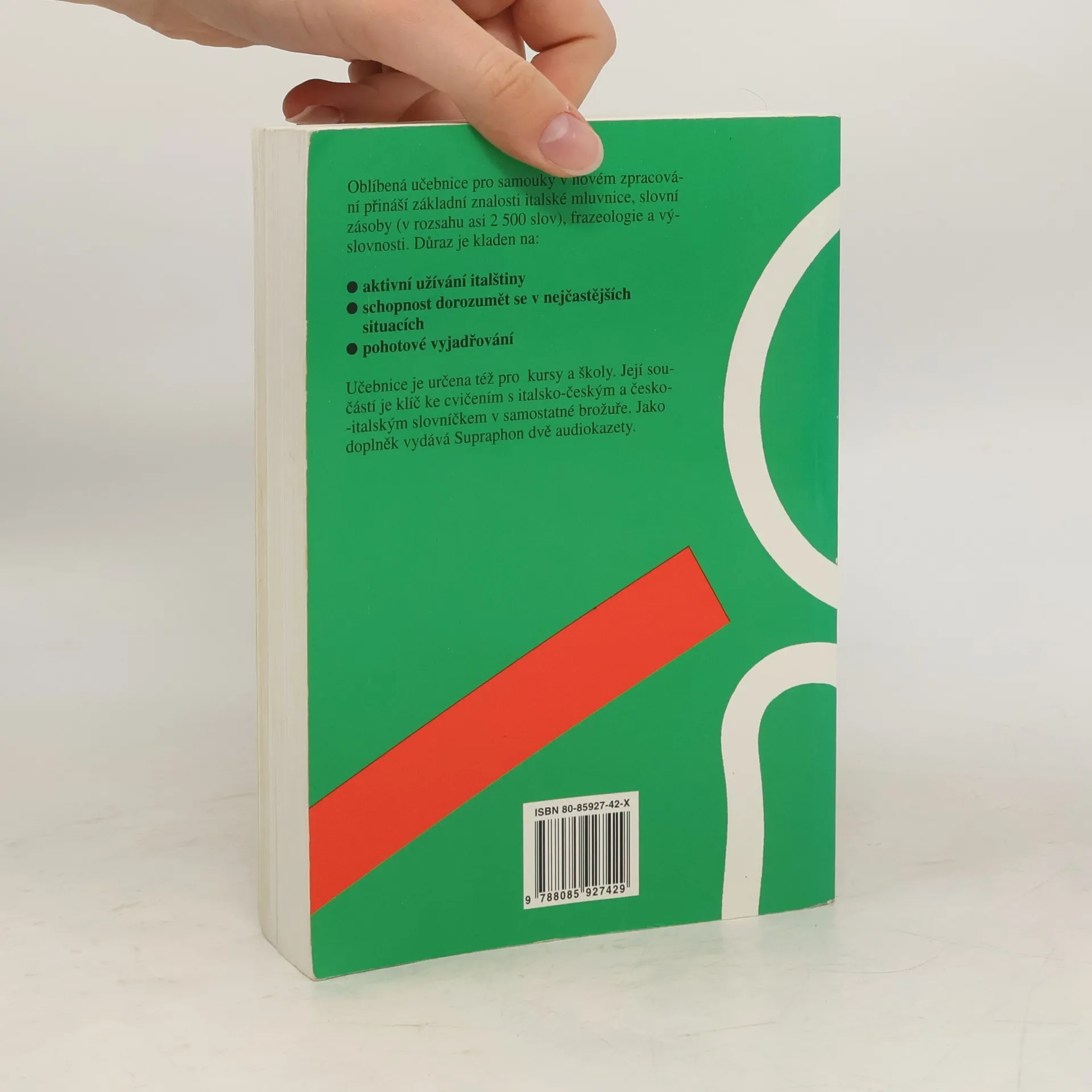 Oblíbená učebnice pro samouky v novém zpracování přináší základní znalosti italské mluvnice, slovní zásoby (v rozsahu asi 2500 slov ), frazeologie a výslovnosti. Důraz je kladen na: aktivní užívání italštiny schopnost dorozumět se v nejčastějších situacích pohotové vyjádřováníUčebnice je určena též pro školy a kursy. Její součásti je brožura obsahující klíč ke cvičením s italsko-českým a česko-italským slovníčkem. Jako samostatný doplněk vydává Supraphon audionahrávku.