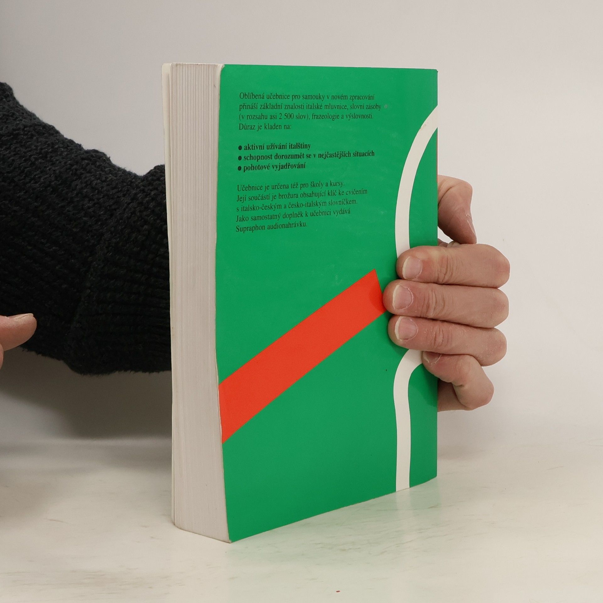 Oblíbená učebnice pro samouky v novém zpracování přináší základní znalosti italské mluvnice, slovní zásoby (v rozsahu asi 2500 slov ), frazeologie a výslovnosti. Důraz je kladen na: aktivní užívání italštiny schopnost dorozumět se v nejčastějších situacích pohotové vyjádřováníUčebnice je určena též pro školy a kursy. Její součásti je brožura obsahující klíč ke cvičením s italsko-českým a česko-italským slovníčkem. Jako samostatný doplněk vydává Supraphon audionahrávku.