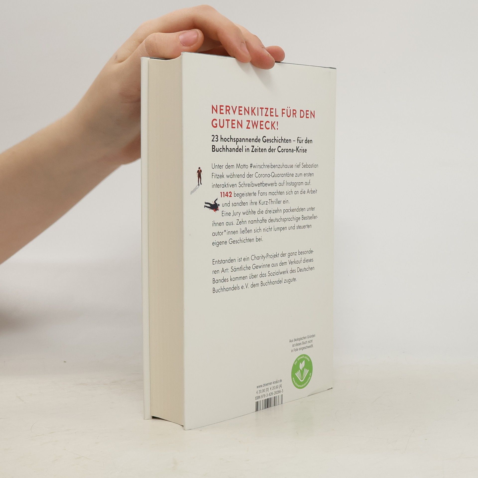 Die Pandemie-Zwangspause nutzen und gemeinsam ein Buch schreiben! Sebastian Fitzek, Tausende Thriller-Fans und namhafte deutschsprachige Bestseller-AutorInnen unterstützen mit spannenden Kurzgeschichten den Buchhandel in Zeiten der Corona-Krise Unter dem Motto #wirschreibenzuhause hat Bestseller-Autor Sebastian Fitzek Ende März 2020 seine Instagram-Follower zu einem interaktiven Schreibwettbewerb aufgerufen. 1142 begeisterte Fans machten sich an die Arbeit und sandten ihre Thriller-Storys ein, die sich um das Thema “Identität” drehen, um das Motiv “Rache” und um den Fund eines Handys mit bedrohlichen Bildern darauf - Nervenkitzel pur! Eine Jury aus AutorInnen, Agenten und VerlagsmitarbeiterInnen wählte die dreizehn packendsten Geschichten aus, die nun in der Thriller-Anthologie \"Identität 1142\" erscheinen. Zusätzlich steuerten zehn der erfolgreichsten deutschsprachigen BestsellerautorInnen eigene spannende Kurzgeschichten bei: Wulf Dorn, Andreas Gruber, Romy Hausmann, Daniel Holbe, Vincent Kliesch, Charlotte Link, Ursula Poznanski, Frank Schätzing und Michael Tsokos - sowie natürlich Sebastian Fitzek selbst. Entstanden ist ein Charity-Projekt der ganz besonderen Art: Sämtliche Gewinne aus dem Verkauf der Kurzgeschichten-Anthologie kommen über das Sozialwerk des Deutschen Buchhandels e.V. dem Buchhandel zugute!