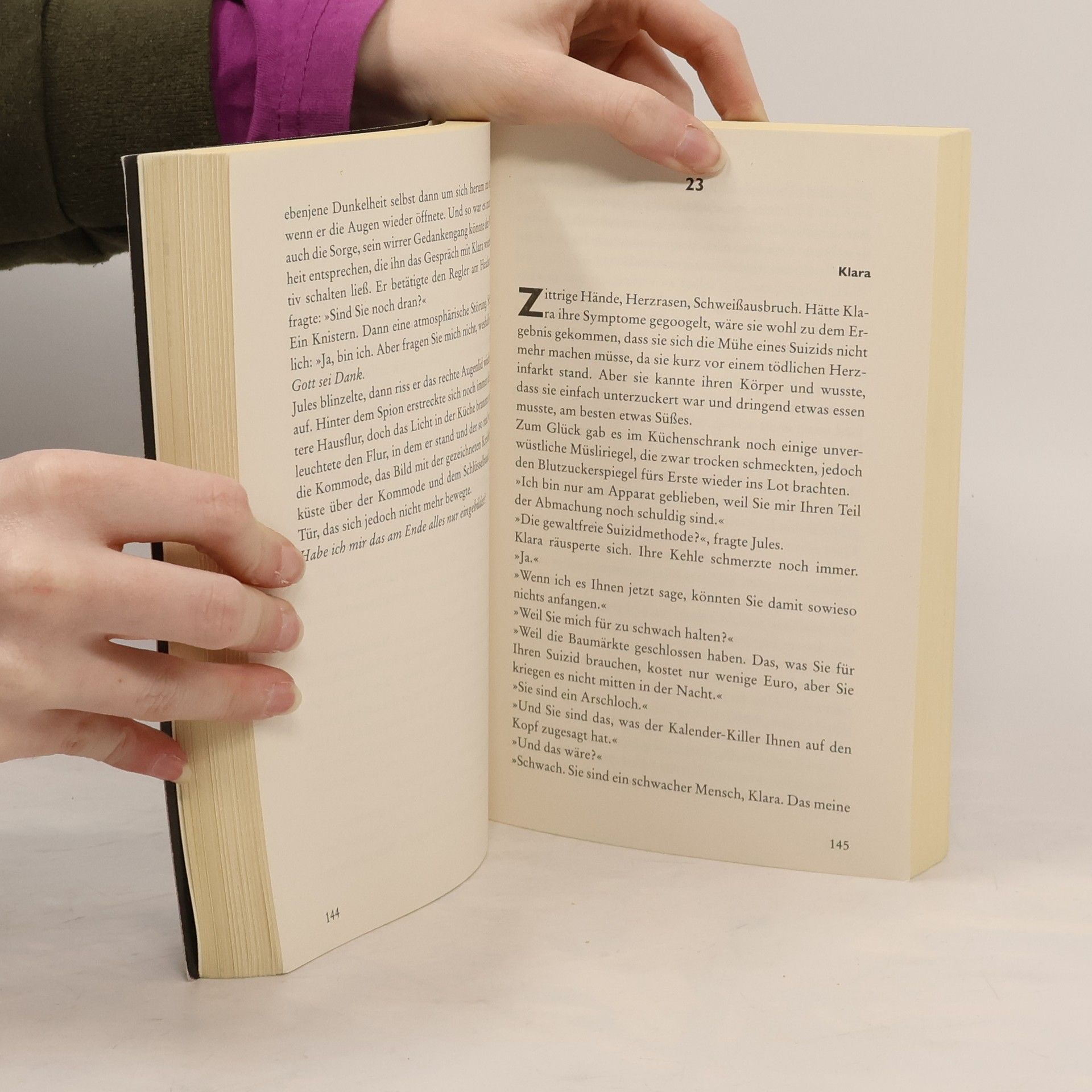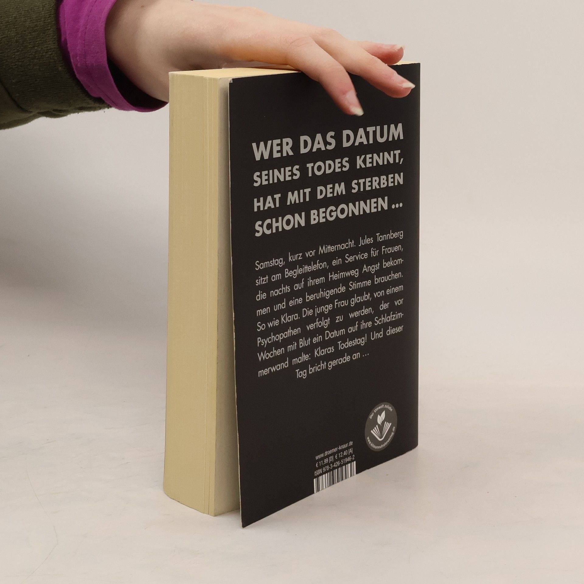 Wer das Datum seines Todes kennt, hat mit dem Sterben schon begonnen – dieser Bestseller von Sebastian Fitzek ist nichts für schwache Nerven! Es ist Samstag, kurz nach 22.00 Uhr. Jules Tannberg sitzt am Begleit-Telefon. Ein ehrenamtlicher Telefon-Service für Frauen, die zu später Stunde auf ihrem Heimweg Angst bekommen und sich einen telefonischen Begleiter wünschen, dessen beruhigende Stimme sie sicher durch die Berliner Nacht nach Hause führt - oder im Notfall Hilfe ruft. Noch nie gab es eine wirklich lebensgefährliche Situation. Bis heute, als Jules mit Klara spricht. Die junge Frau hat entsetzliche Angst. Sie glaubt, von einem Mann verfolgt zu werden, der sie schon einmal überfallen hat und der mit Blut ein Datum auf ihre Schlafzimmerwand malte: Klaras Todestag! Und dieser Tag bricht in nicht einmal zwei Stunden an ... Ein Serienmörder auf freiem Fuß  – geheimnisvoll, beklemmend, nervenaufreibend: Einer der spannendsten Thriller aus der Feder des Bestsellerautors Sebastian Fitzek „Eines vermag dieser Autor wie kein Zweiter: eine Spannung aufzubauen, die zum Schluss schon fast als schmerzhaft empfunden wird.“ krimi-couch