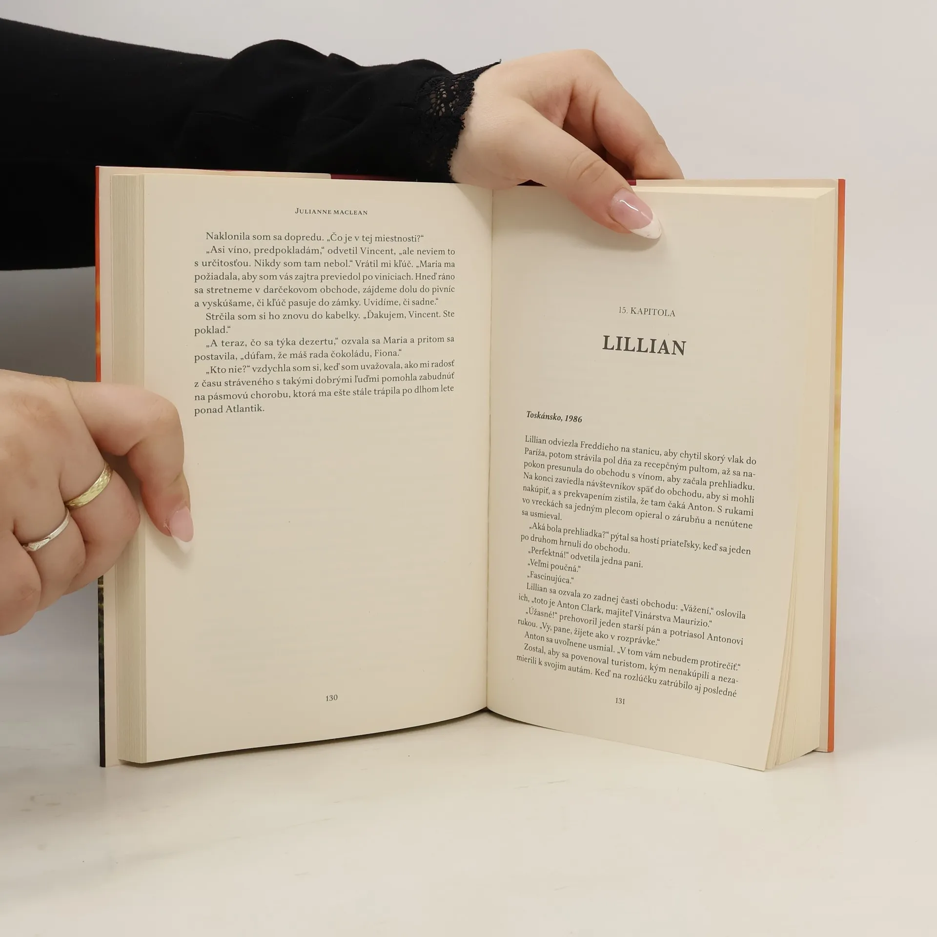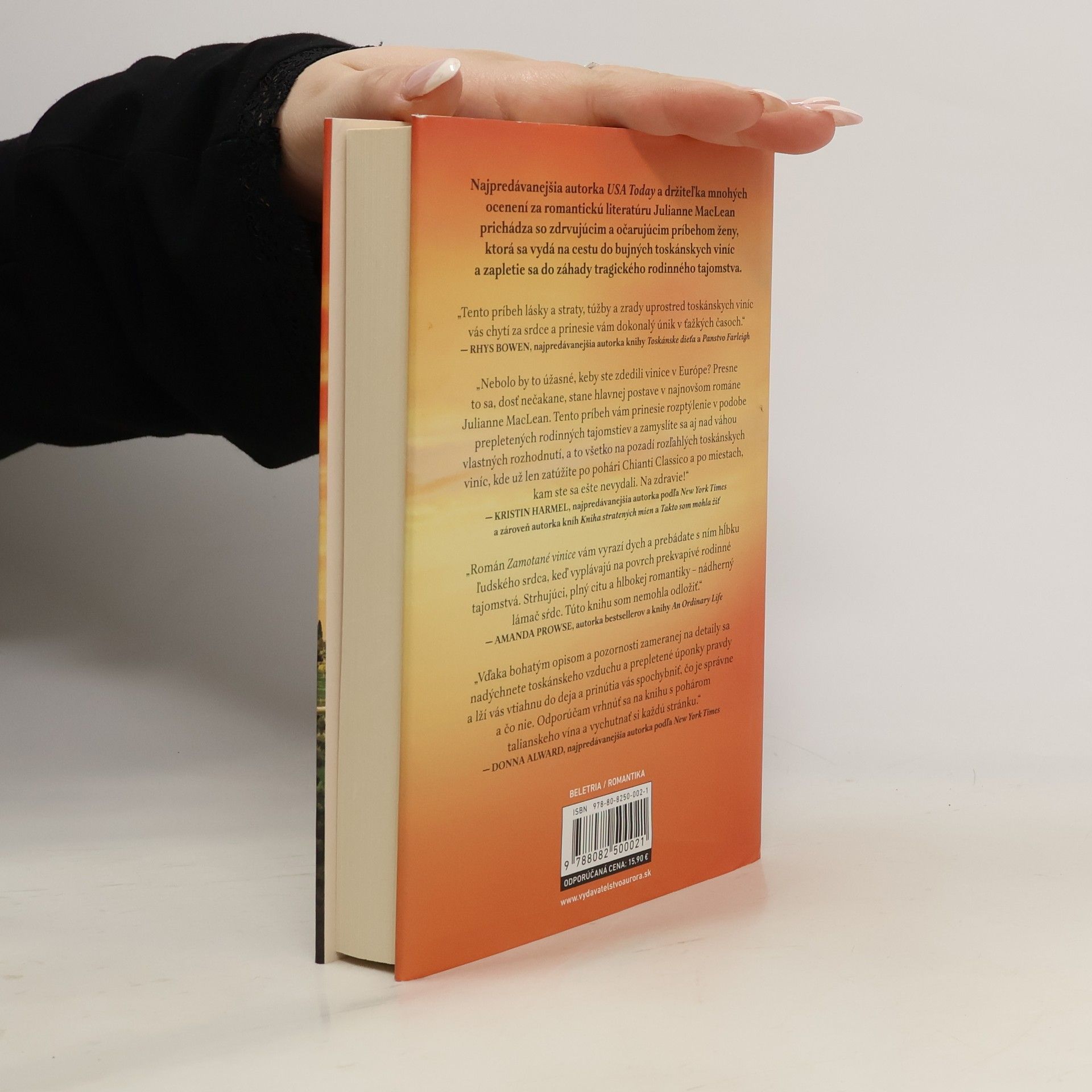 Najpredávanejšia autorka USA Today a ocenená spisovateľka romantickej literatúry Julianne MacLean prináša silný a očarujúci príbeh ženy, ktorá sa vydáva na cestu do toskánskych viníc a odhaľuje tragické rodinné tajomstvo. Fiona sa naučila udržiavať tajomstvá, najmä to, ktoré sa týka ľúbostného romániku jej matky pred tridsiatimi rokmi v Toskánsku. Keď jej právnička oznámi, že jej biologický otec zomrel a zanechal jej dedičstvo, Fiona sa ocitne v Taliansku, kde šokuje otcovu rodinu a vyvoláva napätie medzi nevlastnými súrodencami, ktorí sa snažia poprieť jej právo na podiel v dedičstve. Zatiaľ čo sa odhaľuje záhada matkinej aféry, Fiona čelí zložitým rodinným vzťahom a rivalite. Napriek strachu túži prijať svoj nový osud a hľadá pravdu o osudnom lete, ktoré jej mama strávila s otcom, ktorého nikdy nepoznala. Román je plný toskánskej romantiky a chutí, ponúkajúci srdcervúcu jazdu láskou, tajomstvami, odvahou a pravým zmyslom rodiny. Po vydaní sa kniha stala hitom medzi čitateľkami a získala popredné miesto medzi najpredávanejšími elektronickými knihami na Amazone.