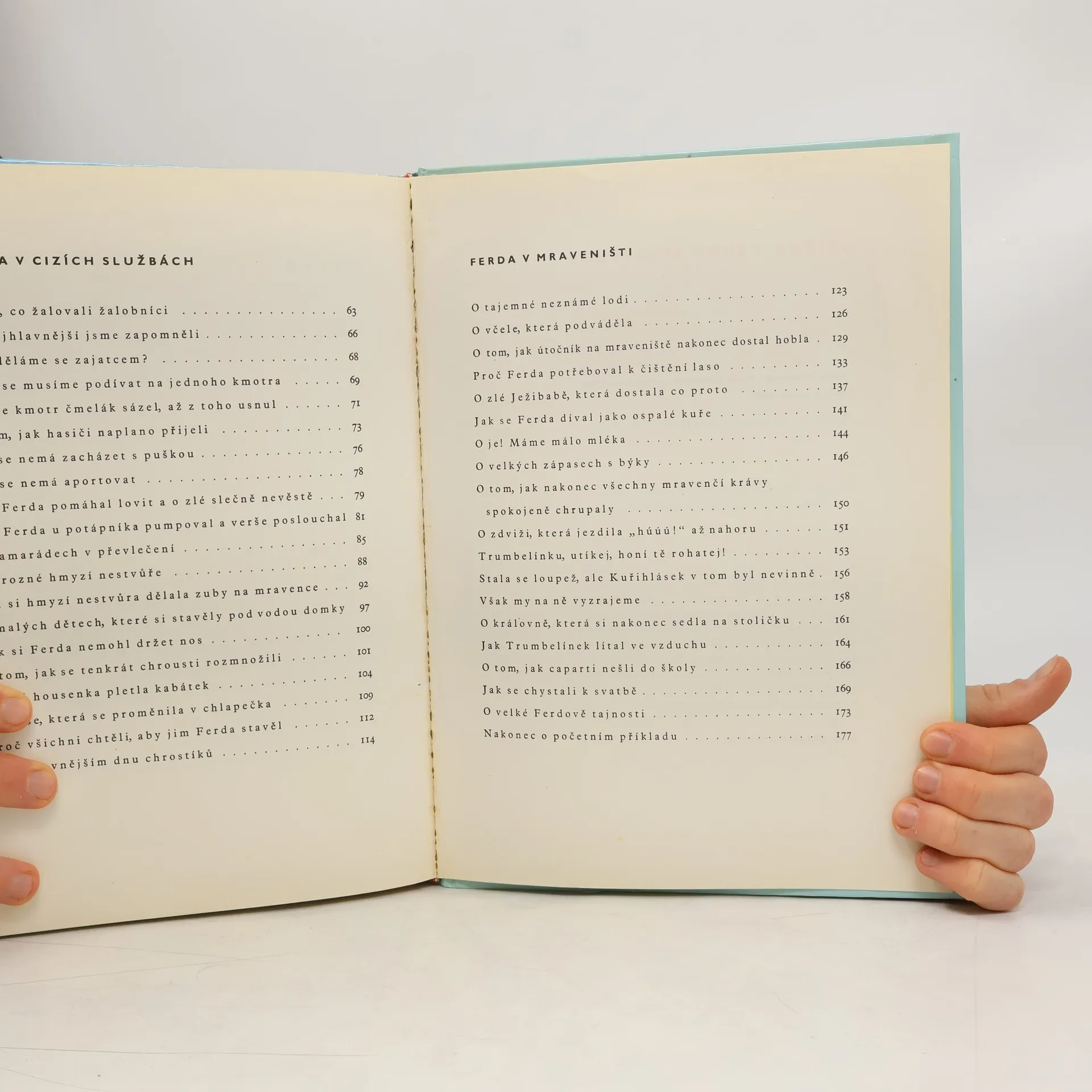 Ferda si poradí s prácemi všeho druhu: zapřáhne do kočáru pana Hlemýždě, ochočí si zeleného koníka, uspořádá hostinu pro rodinu malých ploštiček, nešťastně se zamiluje a nakonec jen taktak unikne nespravedlivému výprasku a uprchne do světa. Ale Ferda by nebyl Ferda, kdyby si neporadil s krvežíznivým Ťutínkem i s mravencožravou paní Střevlíkovou, a nakonec postaví larvičkám chrostíků tak krásné podvodní domečky, že si vyslouží svobodu a vrátí se do rodného mraveniště! Tam se vrhne do vymýšlení všelijakých zlepšováků, ať už při lovu divokých mšic nebo čištění chodeb mraveniště. Mraveniště přepadnou loupežní cizí mravenci, ale pak se vše vysvětlí a příběh končí hromadnou svatbou. Někteří ženichové a nevěsty, ti, o které Ferda zvláště pečoval, mají na krku stejné červené kravaty jako on sám! Kniha se skládá ze tří částí : Ferda Mravenec, Ferda Mravenec v cizích službách, Ferda v mraveništi.