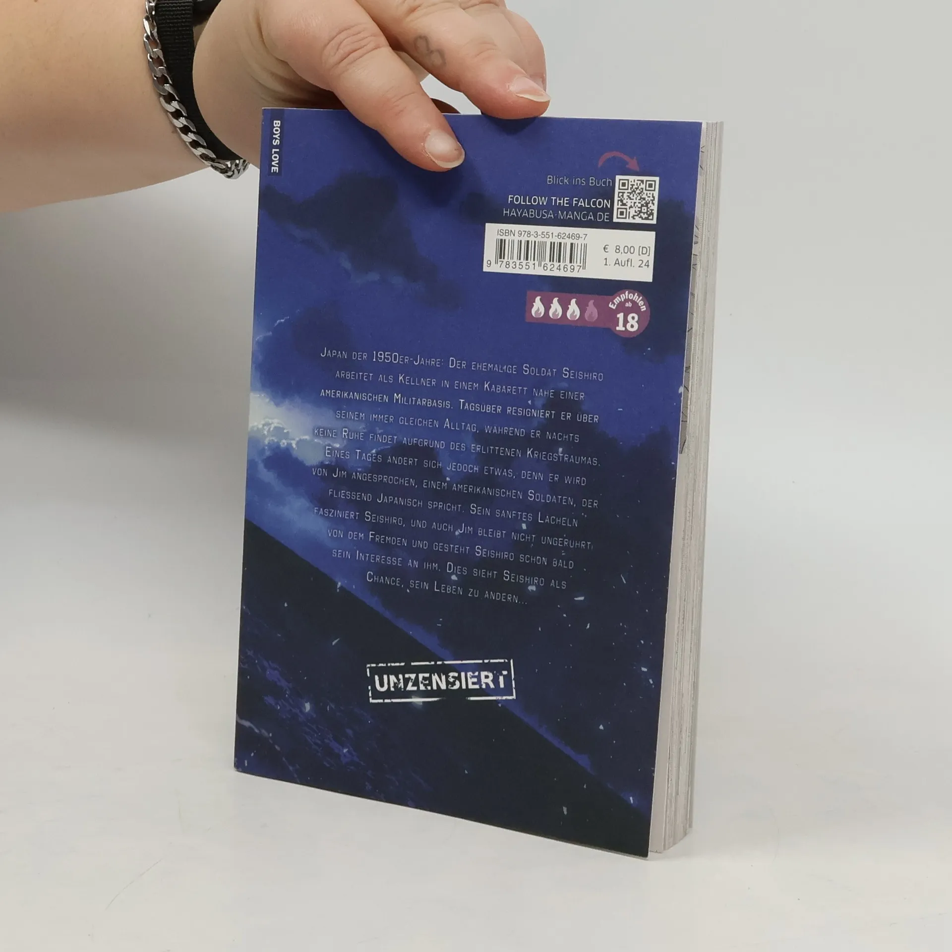 Einfühlsame Boys-Love-Story im Japan der 1950er-Jahre: Der ehemalige Soldat Seishiro, der als Kellner in einem Kabarett arbeitet, trifft auf den amerikanischen Soldaten Jim. Ihre Begegnung weckt in Seishiro die Hoffnung auf Veränderung und eine neue Perspektive nach seinem Kriegstrauma. Einzelband.