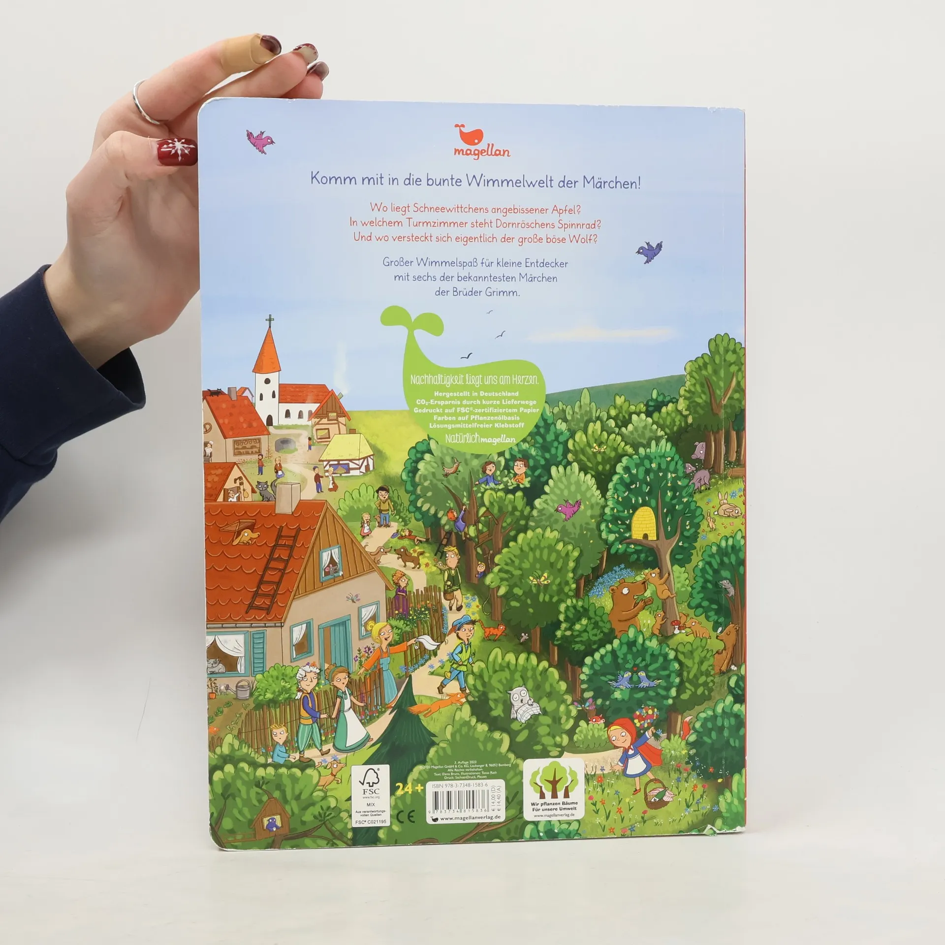 Dieses großformatige Wimmelmärchenbuch erzählt sechs bekannte Märchen der Brüder Grimm in detailreichen Bildern. Es bietet eine Bilderleiste zum Suchen zentraler Figuren und Gegenstände und enthält auf der letzten Doppelseite kurze Zusammenfassungen für eine Auffrischung der Märcheninhalte.