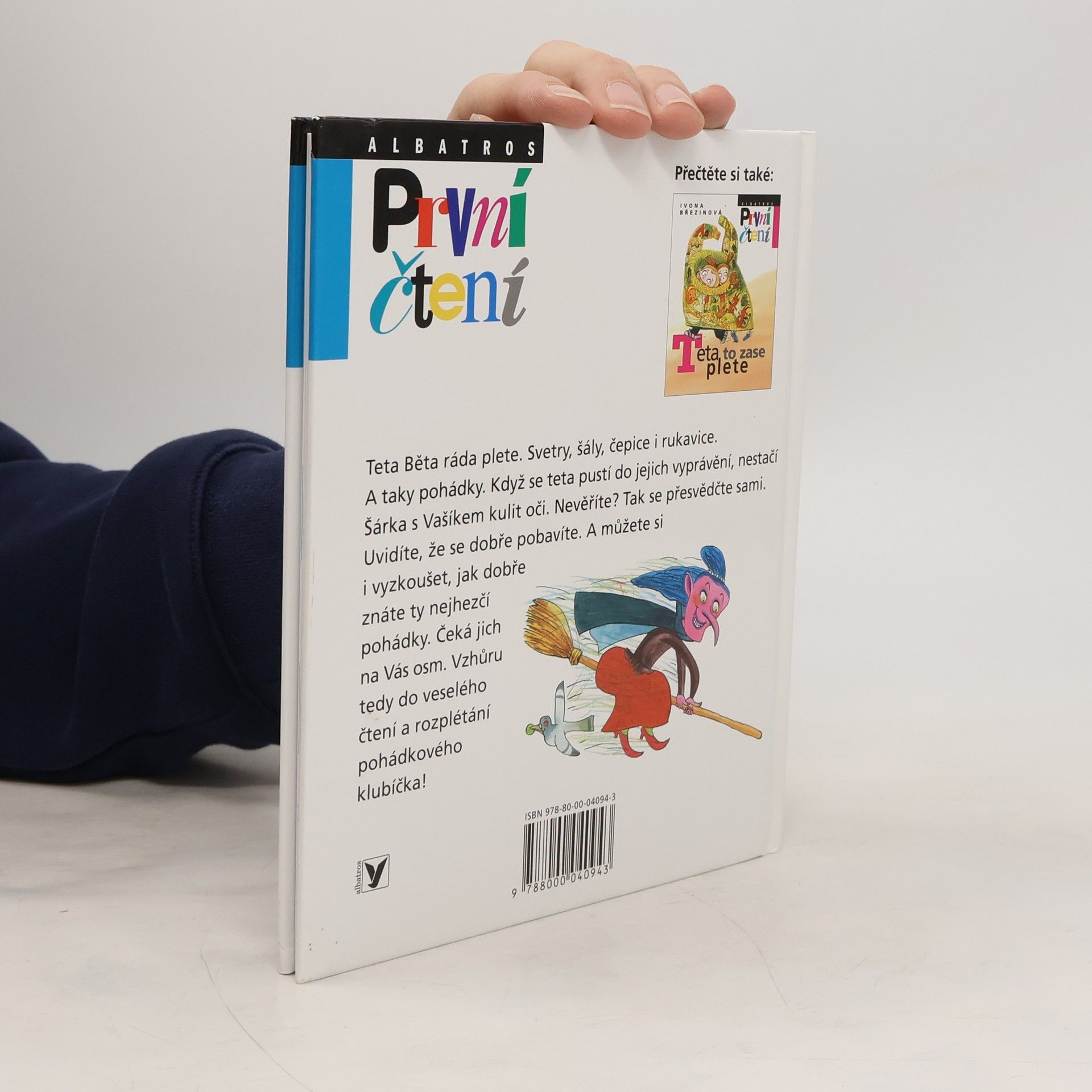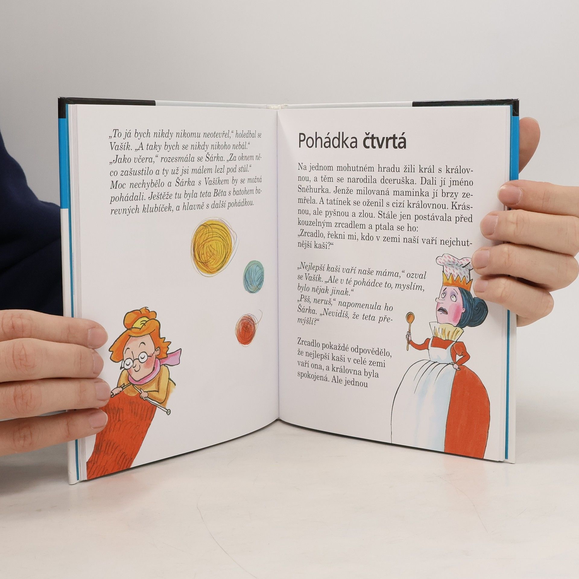 Teta Běta ráda plete. Svetry, čepice, rukavice i šály. A taky pohádky. Když se teta pustí do jejich vyprávění, nestačí Šárka s Vašíkem kulit oči. V tetiných pohádkách Červená karkulka potká v lese jelena se zlatými parohy, Popelka leze na strom a hledá světýlko, Sněhurka trpaslíkům vaří ze známého hrnečku kaši a probuzení Šípkové Rů- ženky je přímo k neuvěření. Malí čtenáři si však na nich mohou skvěle vyzkoušet, jak dobře znají ta nejhezčí pohádková vyprávění.