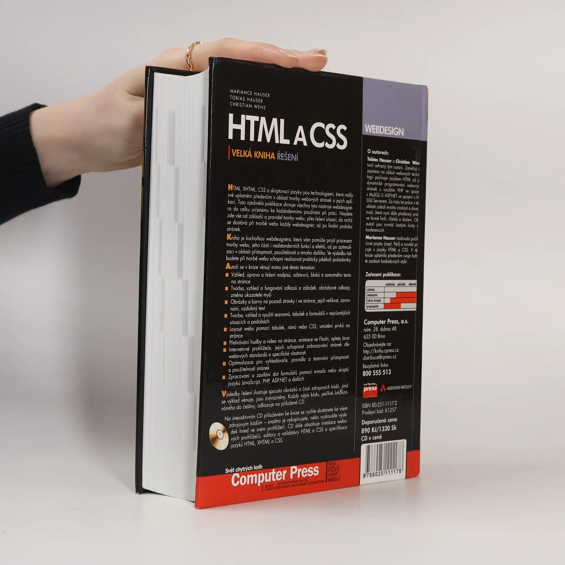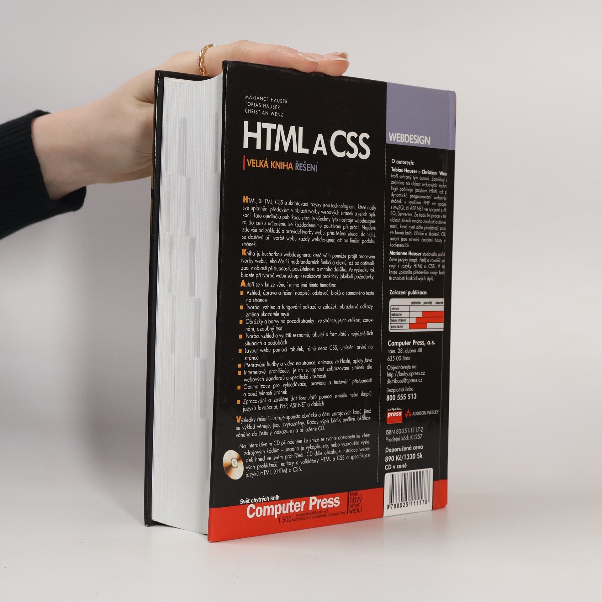 HTML, XHTML, CSS a skriptovací jazyky jsou klíčovými technologiemi pro tvorbu webových stránek a aplikací. Tato publikace shrnuje nástroje webdesignéra do praktického celku pro každodenní použití. Obsahuje vše od základů webové tvorby, přes řešení běžných problémů, až po finální podobu stránek. Kniha funguje jako kuchařka, která vás provede procesem tvorby webu včetně pokročilých funkcí a efektů, optimalizace přístupnosti a použitelnosti. Autoři se zaměřují na témata jako vzhled a úprava textu, odkazy, obrázky, barvy, seznamy, tabulky a formuláře. Dále pokrývají layout webu, přehrávání médií, animace a specifika internetových prohlížečů. Optimalizace pro vyhledávače a testování přístupnosti jsou také součástí obsahu. Publikace obsahuje ilustrace a části zdrojového kódu, které jsou zvýrazněny a lokalizovány do češtiny. Autoři, Tobias Hauser a Christian Wenz, mají bohaté zkušenosti v oblasti webových technologií, zatímco Marianne Hauser přináší znalosti kaskádových stylů. Společně sdílejí své dovednosti prostřednictvím knih, článků a školení.