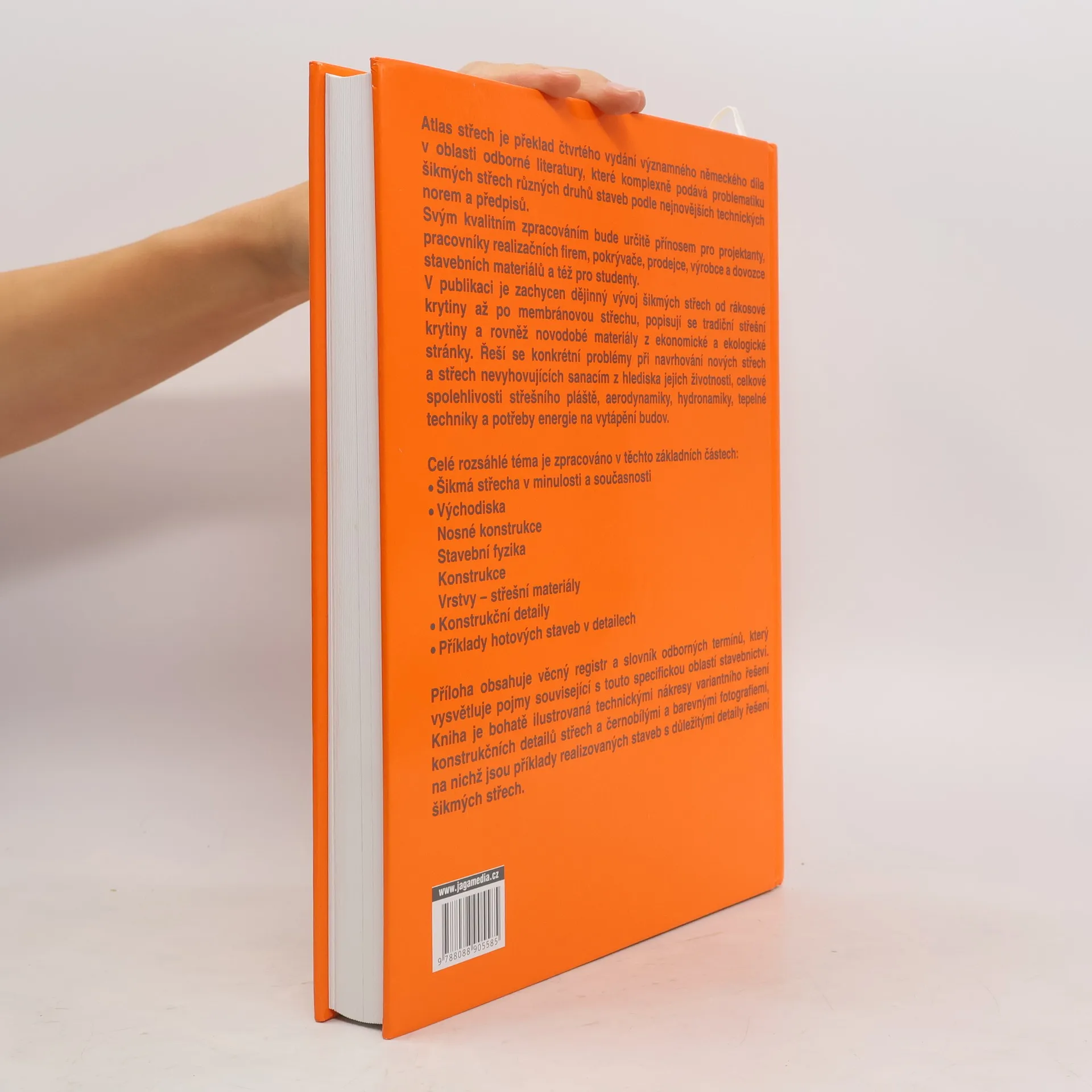 Čtenář získá v publikaci celkový přehled v problematice šikmých střech. Podrobně se zabývá nosnými konstrukcemi střech, fyzikálními vlastnostmi, konstrukčními principy, jednotlivými vrstvami střechy, konstrukčními detaily, jakož i s historií šikmých střech. V závěrečné časti jsou na fotografiích a technických nákresech realizovaných střech z různých materiálů názorně vysvětlené skladby a technické řešení detailů. V publikaci najdete přes 1800 obrázků a 220 fotografií.