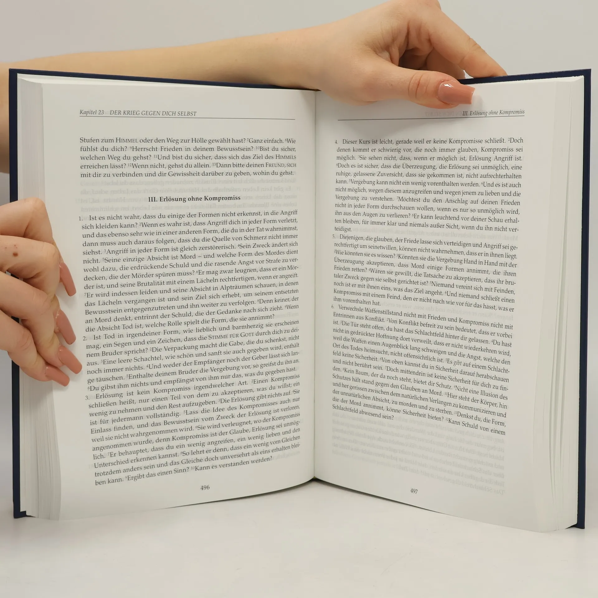EIN KURS IN WUNDERN ist aufgrund seiner Synthese von zeitlosen geistigen Einsichten und wesentlichen psychologischen Erkenntnissen einzigartig unter den spirituellen Traditionen der Welt. Er zeigt uns einen Weg zu innerem Frieden, zu einem Dasein, das in der Welt, aber nicht von der Welt ist. Der Kurs ist nicht als Grundlage für eine neue Religion, Bewegung oder Vereinigung gedacht. Vielmehr dient er unabhängig von äußeren Autoritäten dem Selbststudium. Er richtet sich an Menschen, die nach einer friedlicheren Betrachtungsweise für ihr Leben und ihren Alltag suchen. Das Werk besteht aus dem Textbuch, dem Übungsbuch und dem Handbuch für Lehrer. Im Textbuch werden die Konzepte dargelegt, auf denen das Denksystem des Kurses gründet. Die darin enthaltenen Gedanken stellen die Grundlage für die 365 Lektionen des Übungsbuches dar, bei denen das Hauptgewicht auf der täglichen Erfahrung durch die Anwendung liegt. Das Handbuch für Lehrer gibt Antworten auf viele Fragen, die sich beim Studium ergeben. Wunder im Sinne des Kurses haben nichts mit unerklärlichen Phänomenen in der Außenwelt zu tun, sondern sind ausschließlich innere Veränderungen, die uns daran erinnern, dass es tief in uns verborgen eine Identität der Liebe gibt, die keinen Angriff, sondern nur Frieden kennt. Weitere Informationen unter www.greuthof.de