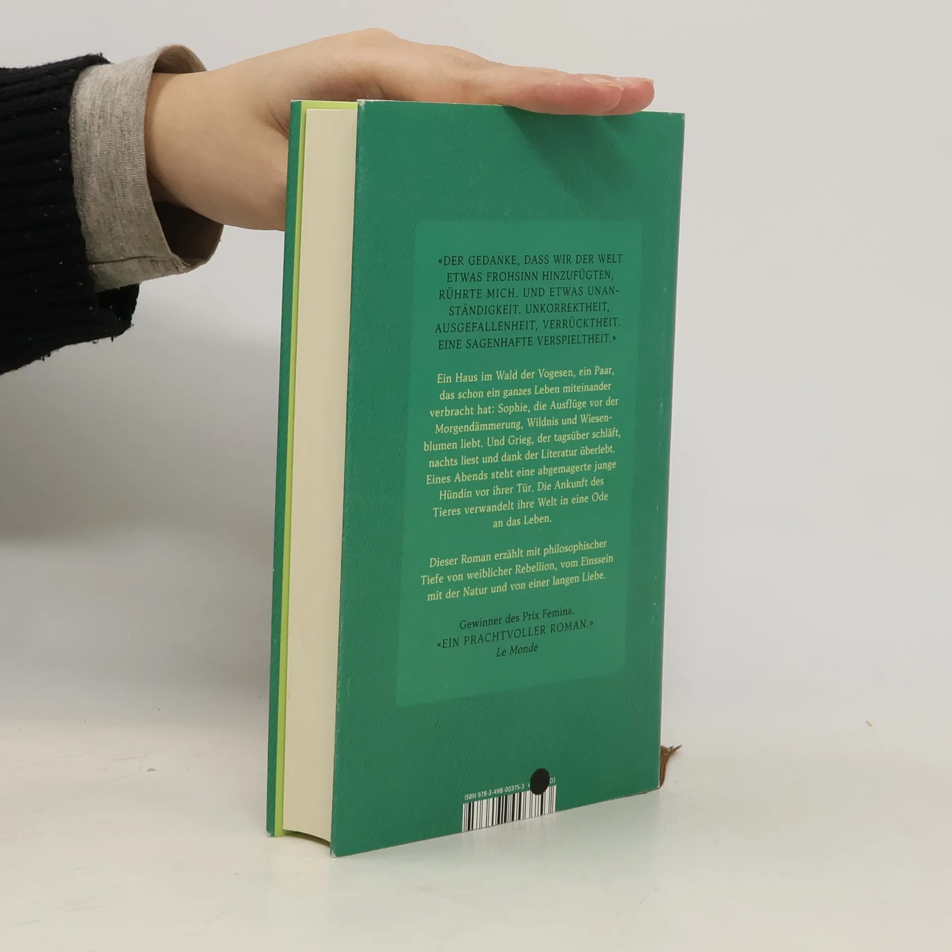 Ein preisgekrönter Roman, der zu einem achtsamen Umgang mit der Natur aufruft. Sophie, eine Künstlerin, und ihr Mann Grieg leben zurückgezogen in den Vogesen. Die Ankunft einer verletzten Hündin verändert ihr Leben und ihren Blick auf die Natur, während Sophie Trost und Inspiration in ihr findet und eine Liebesgeschichte entfaltet.