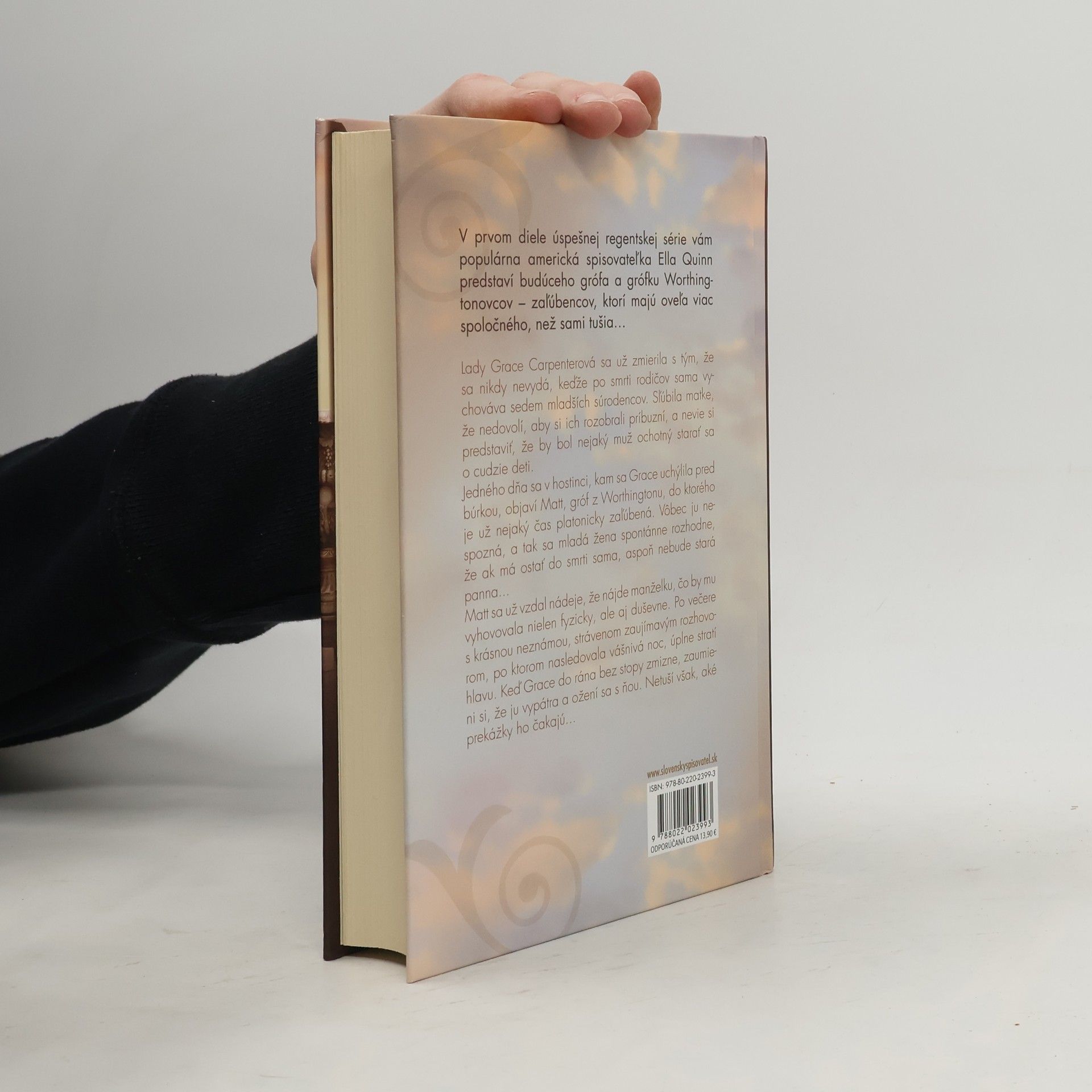 V prvom diele úspešnej regentskej série vám populárna americká spisovateľka Ella Quinn predstaví budúceho grófa a grófku Worthingtonovcov – zaľúbencov, ktorí majú oveľa viac spoločného, než sami tušia… Lady Grace Carpenterová sa už zmierila s tým, že sa nikdy nevydá, keďže po smrti rodičov sama vychováva sedem mladších súrodencov. Sľúbila matke, že nedovolí, aby si ich rozobrali príbuzní, a nevie si predstaviť, že by bol nejaký muž ochotný starať sa o cudzie deti. Jedného dňa sa v hostinci, kam sa Grace uchýlila pred búrkou, objaví Matt, gróf z Worthingtonu, do ktorého je už nejaký čas platonicky zaľúbená. Vôbec ju nespozná, a tak sa mladá žena spontánne rozhodne, že ak má ostať do smrti sama, aspoň nebude stará panna... Matt sa už vzdal nádeje, že nájde manželku, čo by mu vyhovovala nielen fyzicky, ale aj duševne. Po večere s krásnou neznámou, strávenom zaujímavým rozhovorom, po ktorom nasledovala vášnivá noc, úplne stratí hlavu. Keď Grace do rána bez stopy zmizne, zaumieni si, že ju vypátra a ožení sa s ňou. Netuší však, aké prekážky ho čakajú...