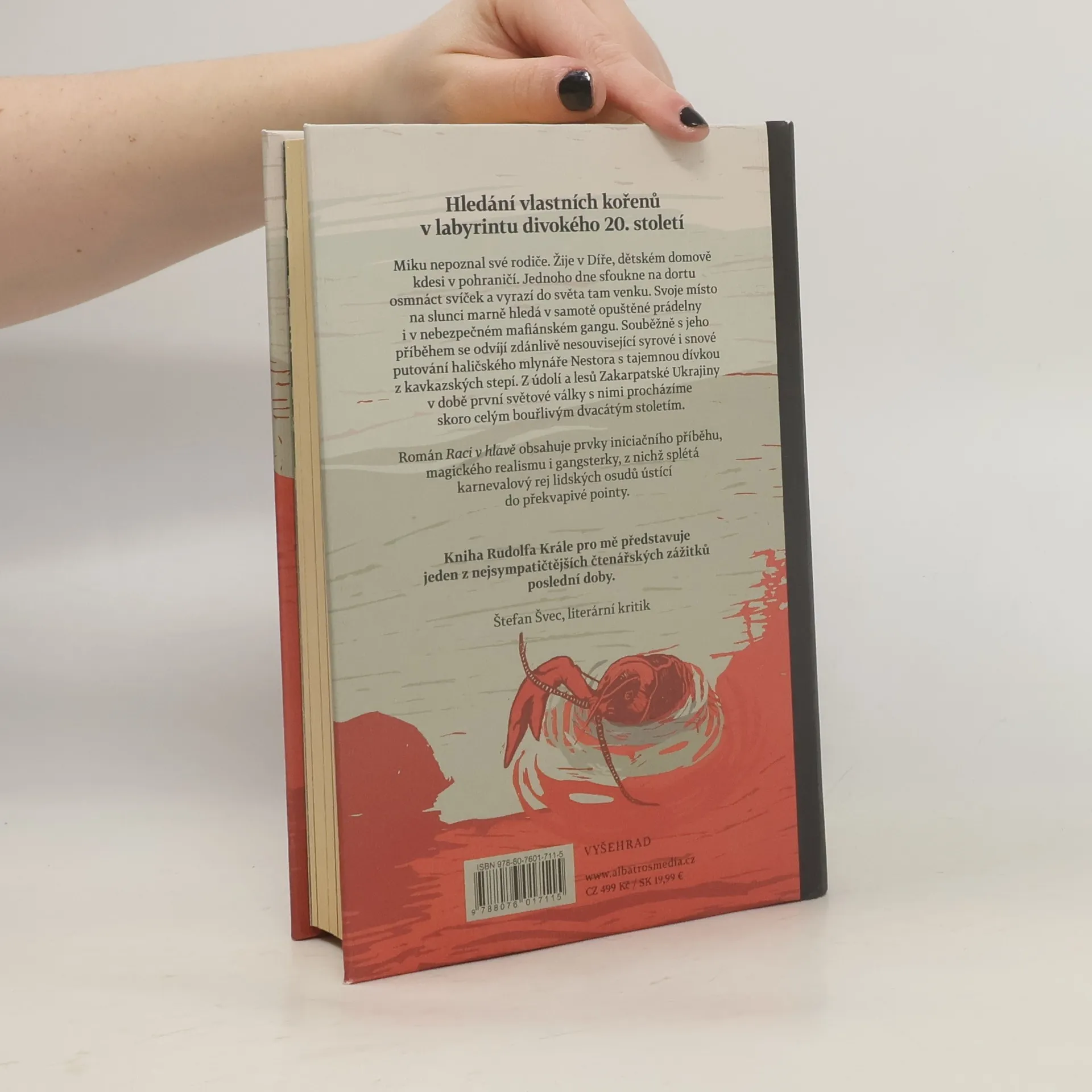 Hledání vlastních kořenů v záhybech pohnutého 20. století Cesta románové hrdiny Mika začíná v dětském domově v pohraničí, odkud se vydává poznávat svět i sebe sama. Jeho příběh se mísí s historií, jež se vynořuje kdesi na zakarpatské Ukrajině. V mnoha tragických i úsměvných zákrutech se obě linie proplétají, aby nakonec dospěly k překvapivému rozuzlení.Román Raci v hlavě je pestrým obrazem lidské touhy po smyslu života. Jeho hledání se odehrává na pozadí turbulentní historie středoevropského prostoru posledních sta let, se všemi jeho vzlety a pády. Text sleduje několik dějových linií, které se různě vynořují a proplétají. Mísí se v něm prvky gangsterky, iniciačního příběhu i magického realismu. Propojuje realistické události z dětského domova, kde hlavní hrdina vyrůstá a odkud se vydává poznávat svět, s dojemnými příběhy nejen z 1. světové války. Ve vyprávění doslova vybuchujícím gejzíry nápadů Rudolf Král dovedně rozvíjí hlavní linie dalšími a dalšími zábavnými i vážnými mikropříběhy lidských osudů, aby nakonec nechal celý román vyznít v nečekané pointě.