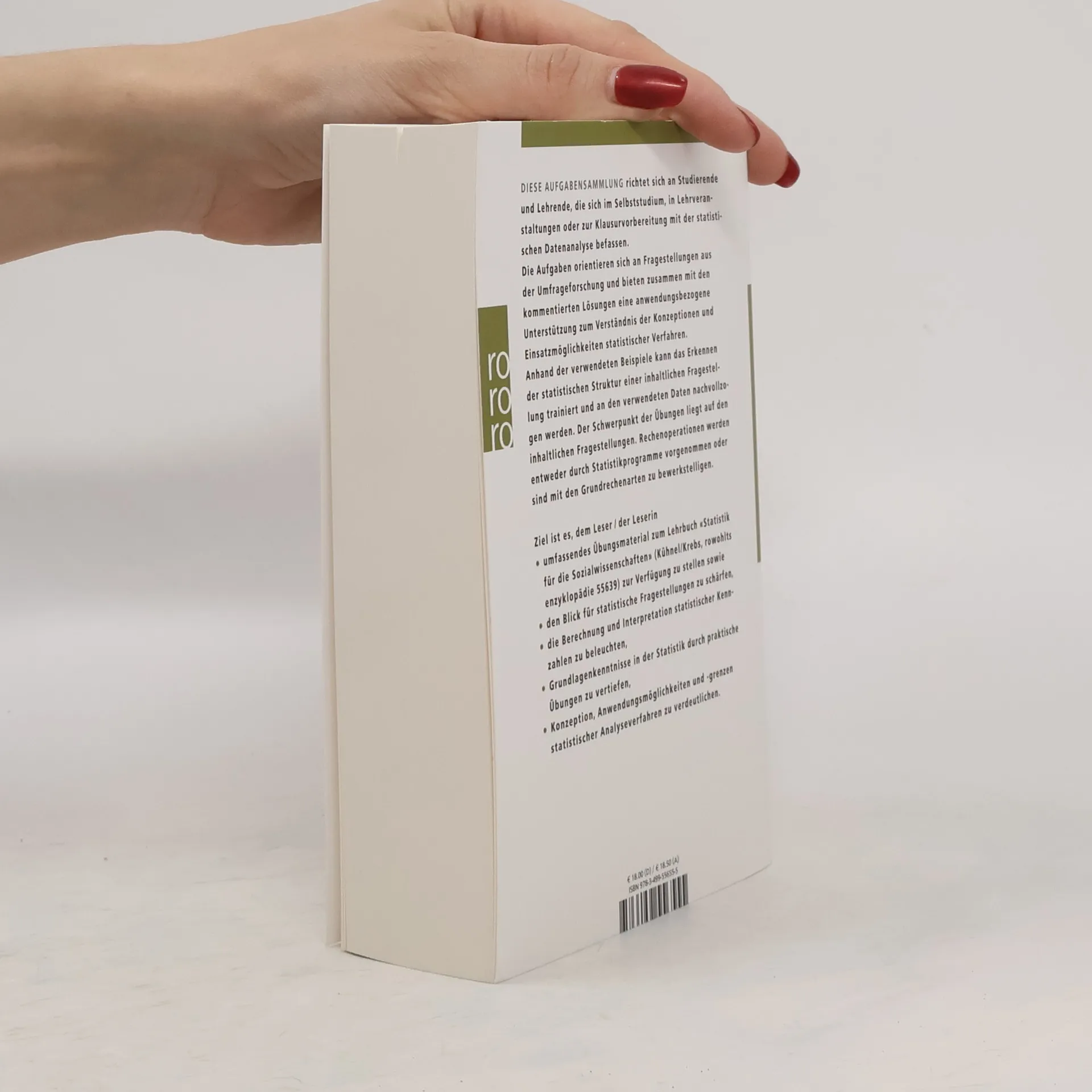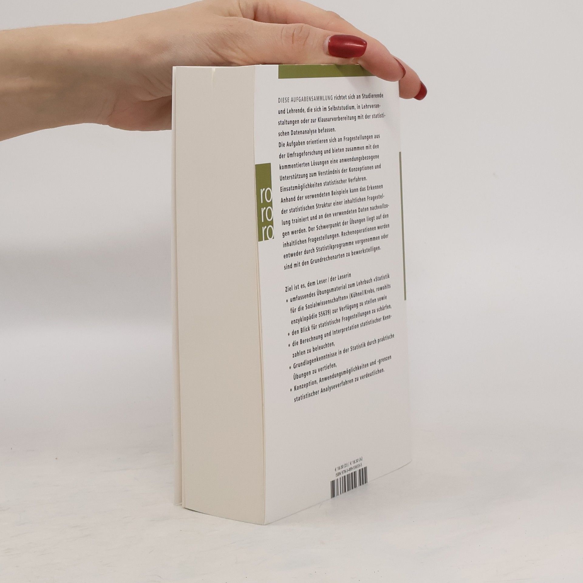 Diese Aufgabensammlung richtet sich an Studierende und Lehrende, die sich im Selbststudium, in Lehrveranstaltungen oder zur Klausurvorbereitung mit der statistischen Datenanalyse befassen.Die Aufgaben orientieren sich an Fragestellungen aus der Umfrageforschung und bieten zusammen mit den kommentierten Lösungen eine anwendungsbezogene Unterstützung zum Verständnis der Konzeptionen und Einsatzmöglichkeiten statistischer Verfahren. Anhand der verwendeten Beispiele kann das Erkennen der statistischen Struktur einer inhaltlichen Fragestellung trainiert und an den verwendeten Daten nachvollzogen werden. Der Schwerpunkt der Übungen liegt auf den inhaltlichen Fragestellungen. Rechenoperationen werden entweder durch Statistikprogramme vorgenommen oder sind mit den Grundrechenarten zu bewerkstelligen.Ziel ist es dem Leser / der Leserin• umfassendes Übungsmaterial zum Lehrbuch „Statistik für die Sozialwissenschaften“ (Kühnel/Krebs, rowohlts enzyklopädie 55639) zur Verfügung zu stellen sowie• den Blick für statistische Fragestellungen zu schärfen,• die Berechnung und Interpretation statistischer Kennzahlen zu beleuchten,• Grundlagenkenntnisse in der Statistik durch praktische Übungen zu vertiefen,• Konzeption, Anwendungsmöglichkeiten und -grenzen statistischer Analyseverfahren zu verdeutlichen.
