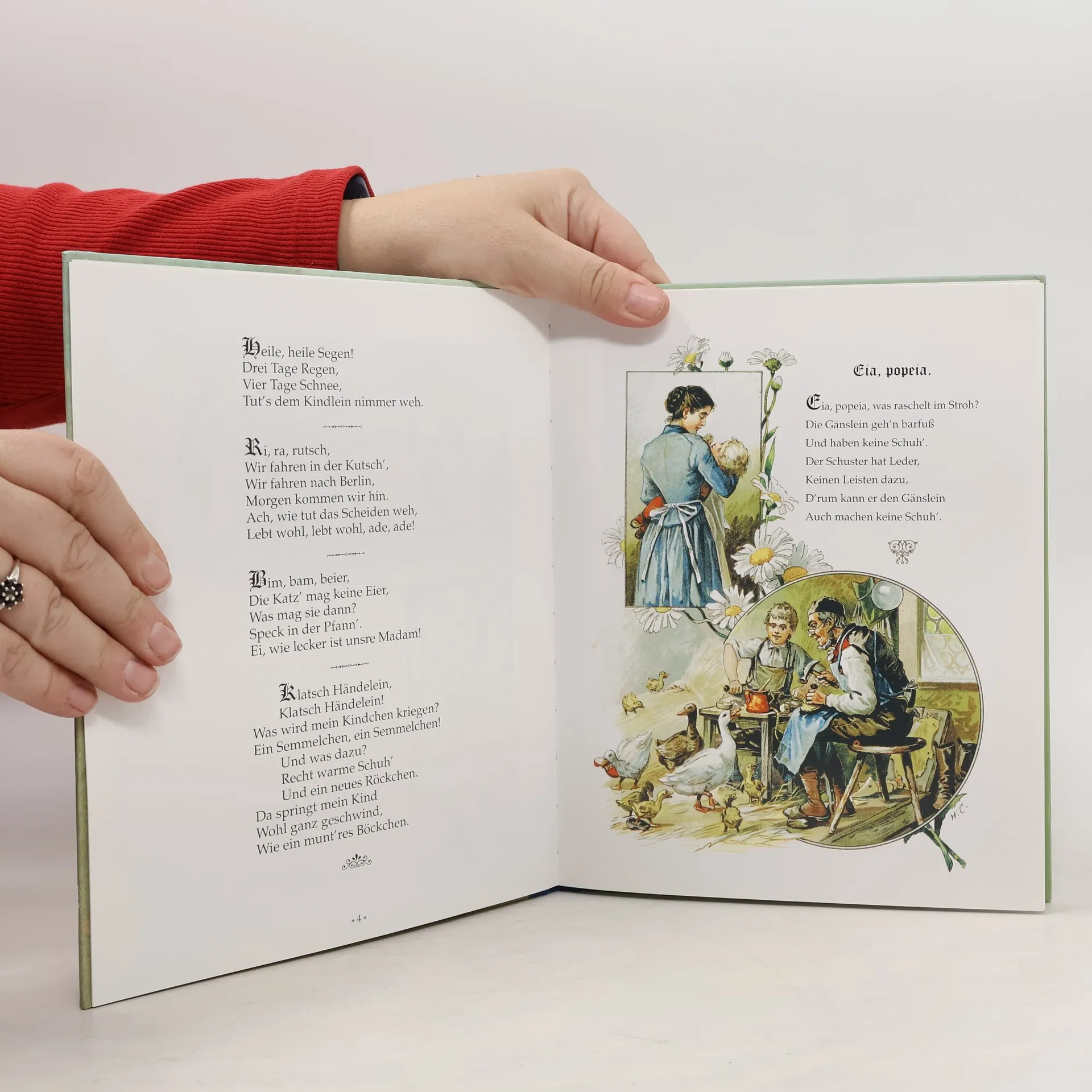 Reprint von 1893 mit 12 Farbdruckbildern und 11 Holzschnittbildern. Enthält Geschichten wie "Der kleine Gast", "Backe, backe Kuchen", "Vom Klapperstorch" und viele weitere.