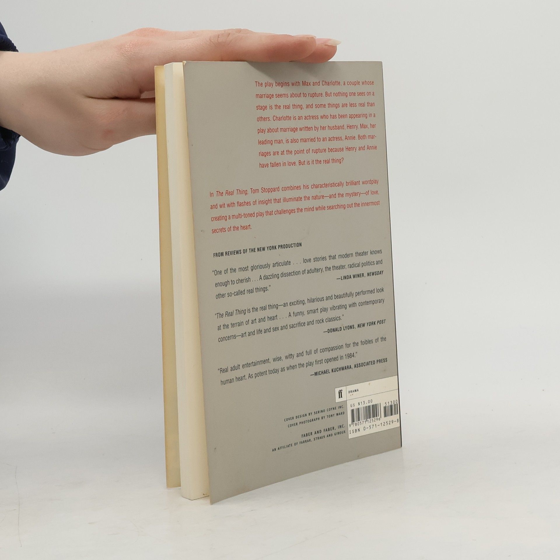 The play begins with Max and Charlotte, a couple whose marriage seems about to rupture. But nothing one sees on a stage is the real thing, and some things are less real than others. Charlotte is an actress who has been appearing in a play about marriage written by her husband Henry. Max, her leading man, is also married to an actress, Annie. Both marriages are at the point of rupture because Henry and Annie have fallen in love. But is it the real thing?The Real Thing was first performed at the Strand Theatre, London, on 16 November 1982.