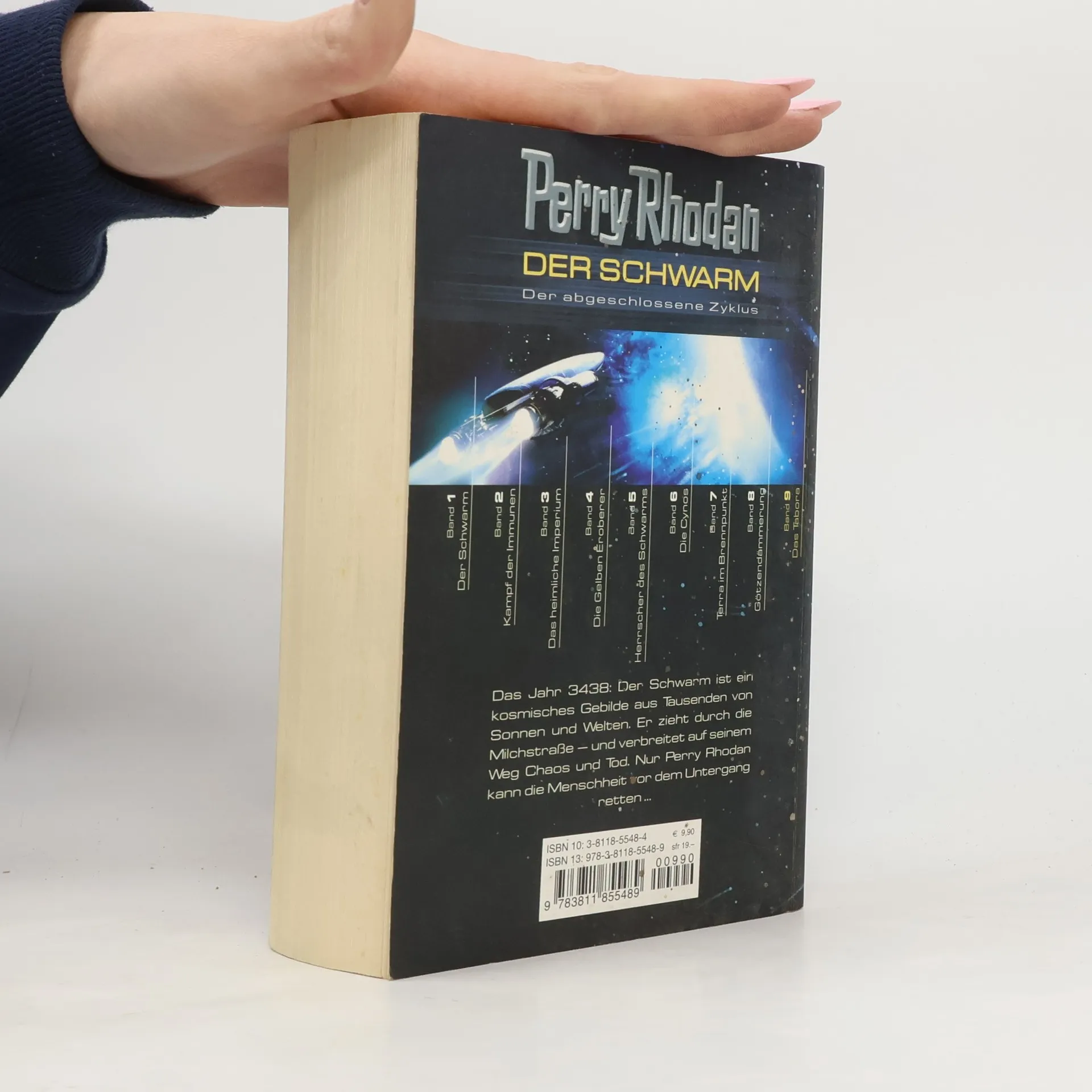 Enthaltene Original-Romane (Heftromane, #564-569):- "Die Zeit mutiert"- "Gucky, der Meisterdieb"- "Planet im Hyperraum"- "Der Mann aus dem Eis"- "Rebellen der Cynos"- "Das Korps der Cappins"Eine gigantische Flotte des Schwarms bedroht das Solsystem und droht, den Paratronschirm zum Zusammenbrechen zu bringen, was gleichbedeutend wäre mit dem Ende der Menschheit. In dieser Situation bricht ein Cyno sein Schweigen. Damit schickt er die Terraner auf die Suche nach dem geheimnisvollen Tabora, dem Schlüssel zur Macht im Schwarm. Perry Rhodan findet es, als schon fast keine Hoffnung mehr für Terra und die anderen Planeten besteht. Doch er selbst kann keinen Gebrauch davon machen - das kann nur ein uralter Cyno, der mit seinem Bruder Nostradamus eine Million Jahre darauf gewartet hat, den Schwarm wieder für sein Volk in Besitz zu nehmen. Damit beginnt die letzte Schlacht um den Schwarm - und der Kampf um die Freiheit der Menschen...