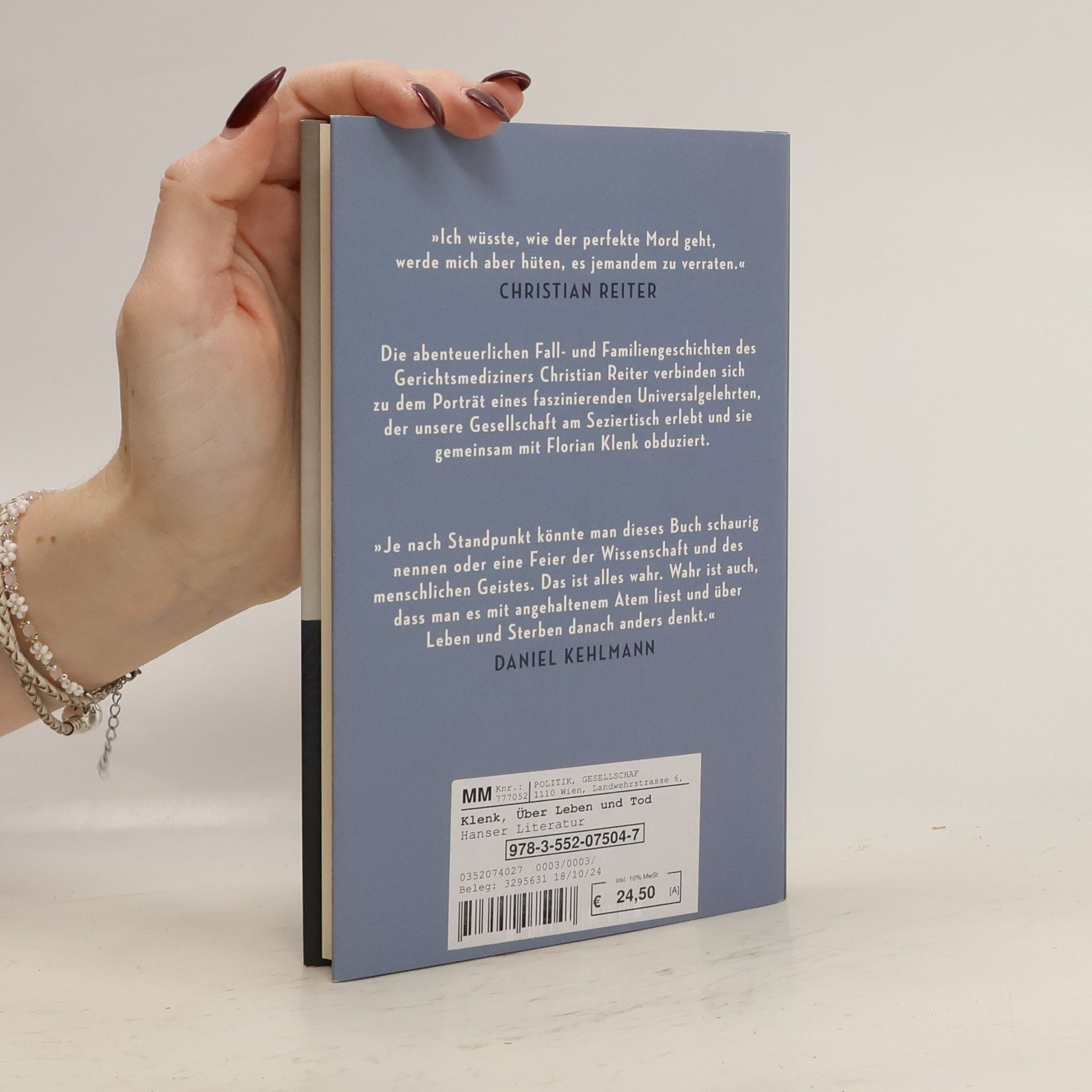Bestsellerautor Florian Klenk spricht mit dem Gerichtsmediziner Christian Reiter über Leben und Tod. „Man liest das Buch mit angehaltenem Atem und denkt über Leben und Sterben danach anders.“ Daniel Kehlmann Ist der Totenschädel Beethovens tatsächlich der seine? Wie identifiziert man die Toten des Lauda-Air-Absturzes in Thailand? Wie hat die „Schwarze Witwe“ Elfriede Blauensteiner ihre Männer ins Jenseits befördert? Und was genau hat es mit den K.-o.-Tropfen auf sich? Der Gerichtsmediziner Christian Reiter kennt die Geheimnisse des Todes. In seinem Studierzimmer sammelt er Schädel, Haare, Larven, Mumien und Totenmasken. Als Falter-Chefredakteur Florian Klenk diese Schätze sieht, entdeckt er die Abgründe des Menschen und die Überzeugungskraft der Wissenschaft. Die abenteuerlichen Fall- und Familiengeschichten des Arztes Reiter verbinden sich zu dem Porträt eines faszinierten Universalgelehrten, der unsere Gesellschaft am Seziertisch erlebt und sie gemeinsam mit Florian Klenk obduziert.