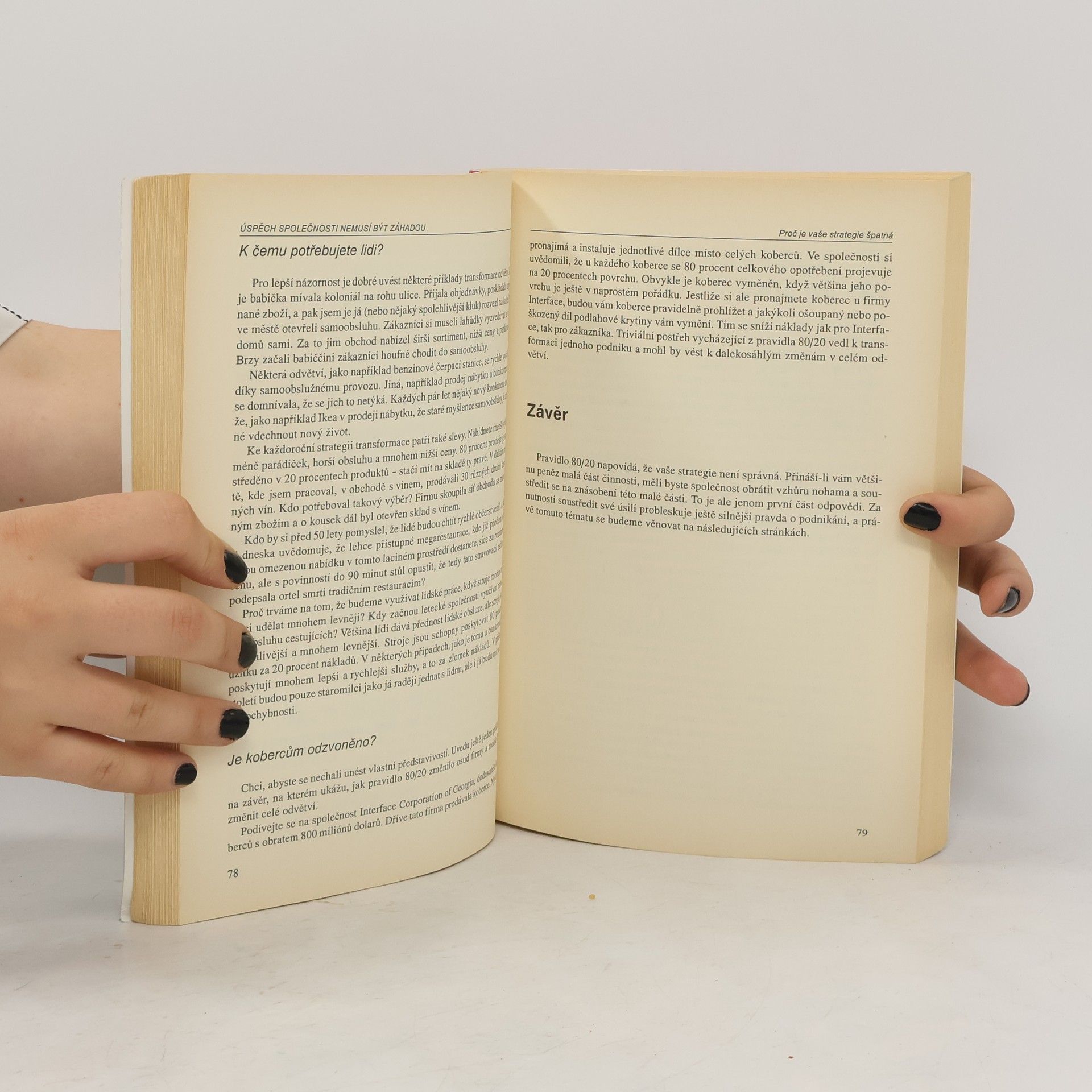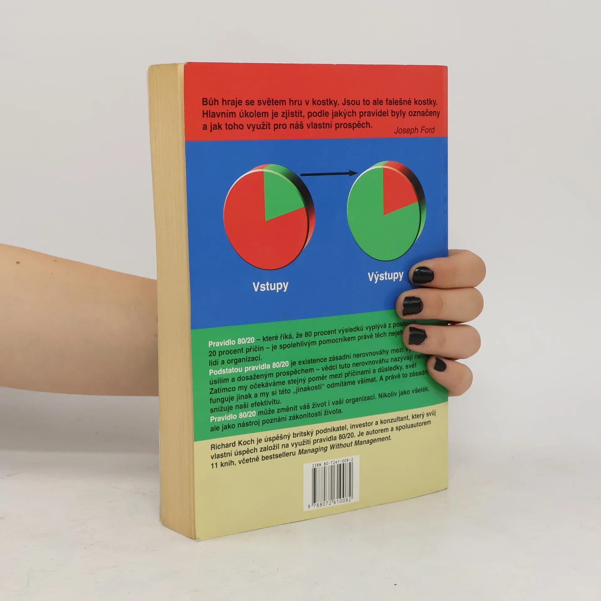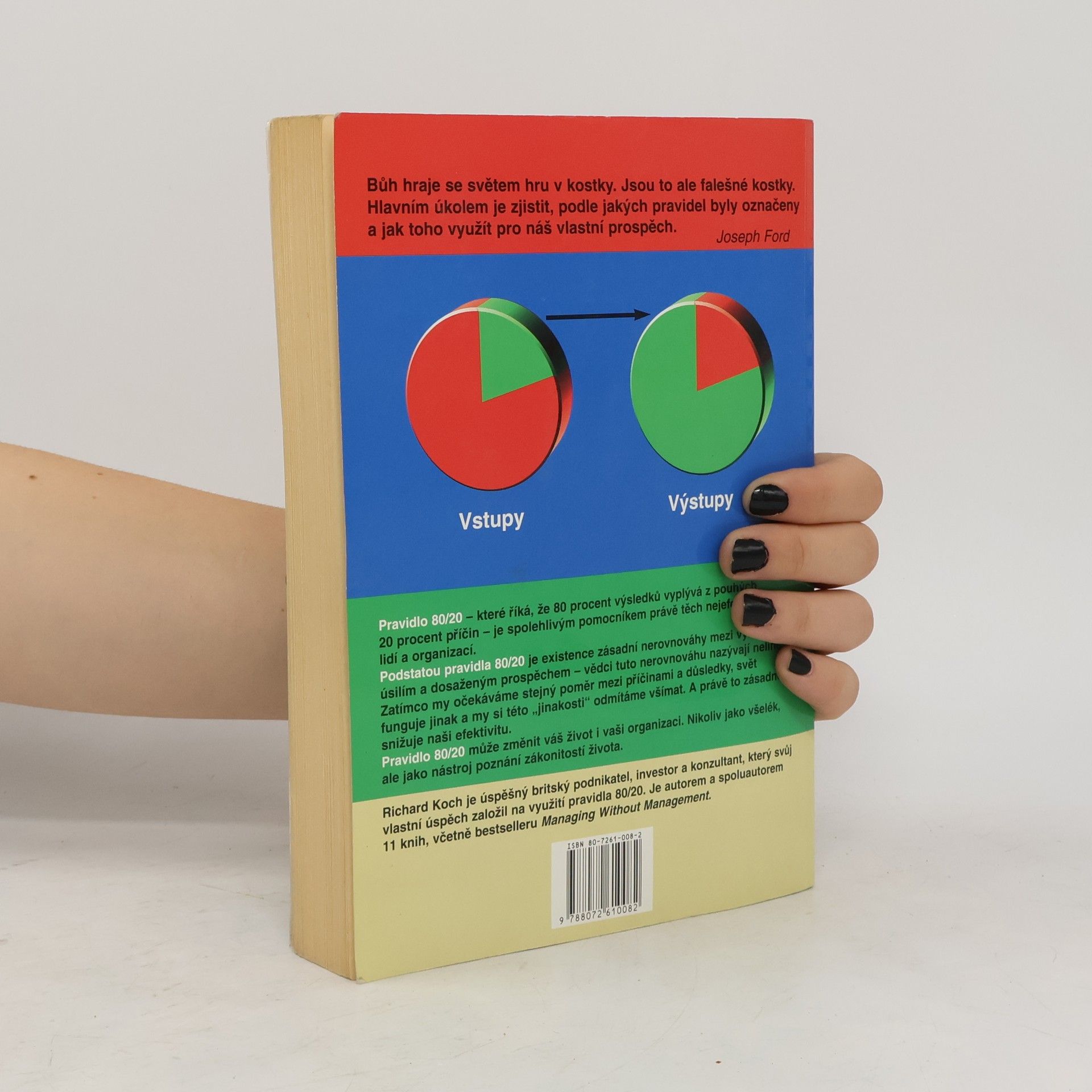 Kontrolujte svůj život, nedovolte, aby okolnosti kontrolovaly vás! Pravidlo 80/20 uvádí, že existuje vnitřně daná nerovnováha mezi příčinami a výsledky, vstupy a výstupy, úsilím a odměnou – 80 procent výstupů je výsledkem 20 procent vstupů a 80 procent výsledků vzniká z 20 procent příčin. V podnikání byla platnost pravidla 80/20 již potvrzena na mnoha příkladech - 20 procent výrobků, které organizace vyrábí, jí přináší 80 procent zisku, 20 procent zákazníků vytváří 80 procent tržeb organizace a 20 procent výrobků a zákazníků také obvykle vytváří 80 procent jejího zisku. Pravidlo 80/20 je první knihou, která ukazuje, jak pravidlo systematicky používat nejen v práci, ale i v osobním životě. Na široké škále příkladů z byznysu, osobního, společenského i politického života ukazuje, jak svět opravdu funguje: 20 procent recidivistů má na svědomí 80 procent trestných činů, 20 procent řidičů způsobuje 80 procent dopravních nehod a 20 procent těch, kteří uzavřou sňatek, se podílí na 80 procentech rozvodové statistiky.