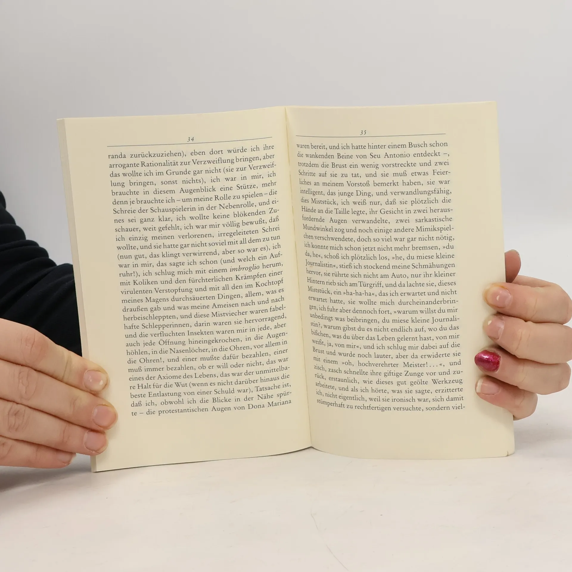 Eine gespannte Liebesbeziehung: Sie, Journalistin, jung, zielstrebig, Stadtmensch, er, zurückgezogen auf dem Land, verschlossen, einsamkeitsbetont, Haus und Garten pflegend. Eines Tages wird die morgendliche Ruhe nach einer Liebesnacht jäh aufgestört: Der Mann entdeckt, dass Blattschneideameisen über Nacht ein Loch in die Hecke seines geliebten Gartens gefressen haben. Er gerät außer sich. Noch im Garten bricht zwischen ihm und der jungen Frau ein verbaler Krieg aus, in dem jeder den anderen aufs bitterste zu verletzen versucht. Außerhalb der schützenden Mauern des Hauses wird aus dem vermeintlichen Liebesspiel das schonungslose Herunterreißen aller Hüllen. Ein Wörterkampf, in dem die Faszination füreinander mitschwingt, der zugleich aber die rücksichtslose Abrechnung mit Wünschen, Träumen, Ansprüchen und Illusionen des anderen bedeutet und atemlos über Seiten jagt, erst am Ende eines jeden Kapitels einen Punkt findet