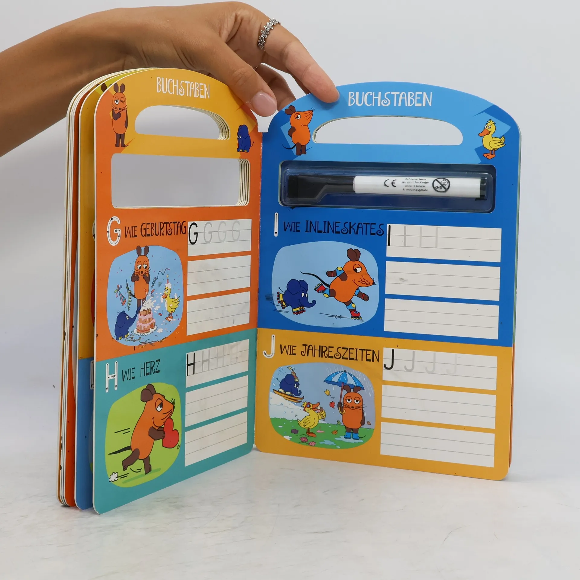 Die schlaue Maus, der Elefant und die Ente unterstützen Vor- und Grundschüler beim Lernen. Mit einem feuchten Tuch können die Übungen einfach wieder gelöscht und beliebig oft wiederholt werden.