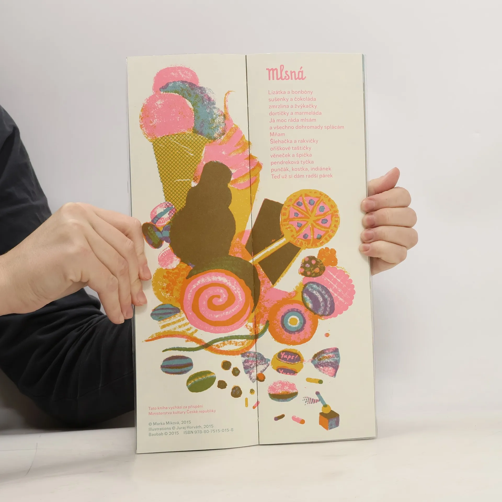 Originální knížka básní v „žvejkačkovém balení“ pro děti. Marka Míková, zpěvačka, divadelnice a spisovatelka, nikdy neměla k poezii daleko. Ve všech jejích knížkách se verše přirozeně prolínají s prózou a je autorkou bezpočtu písňových textů pro kapely Zuby nehty a jiná hudební sdružení. Píše i pro malá představení, která hraje pro děti v nemocnicích. Útlá knížka básní pro děti jen potvrzuje její všestranný talent. Nejsou to básně-veršovánky, spíš poťouchlá zastavení, plná Marčina obvyklého skrytého humoru a zároveň přesných pozorování světa. Najdete v ní samozřejmě i pár exotických zvířat, několik rodinných historek, úvahy o světě a veršované esemesky. Hudbu v tomto případě nahrazují jásavé a létem inspirované ilustrace (včetně spearmint grafické úpravy) Juraje Horvátha.