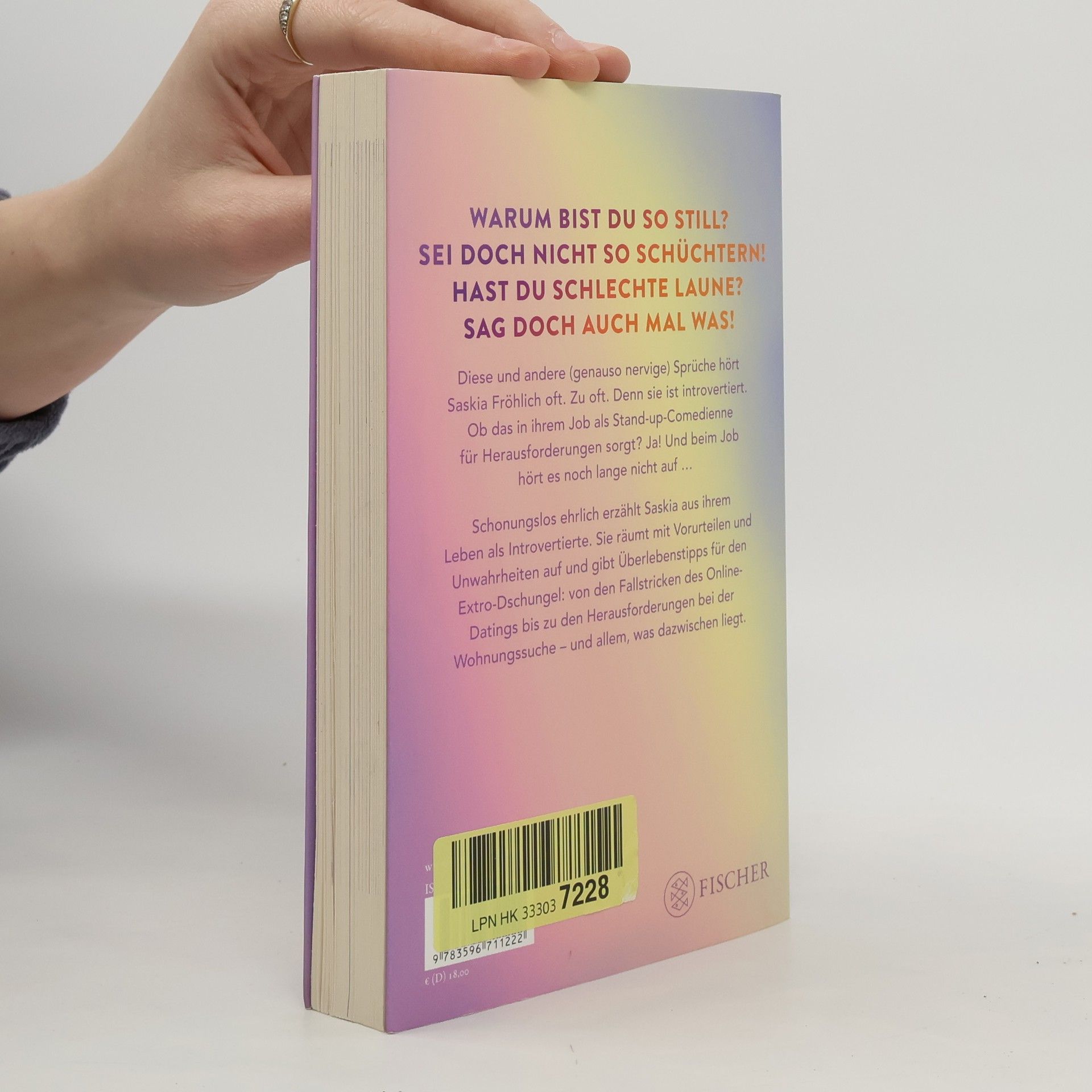 Saskia Fröhlich, eine Stand-up-Comedienne, beleuchtet in ihrem Buch das Leben als introvertierte Person. Sie räumt mit Klischees über Introversion auf und teilt persönliche Anekdoten. Ziel ist es, dass Extrovertierte mehr Verständnis für Introvertierte entwickeln und diese sich selbst besser verstehen.
