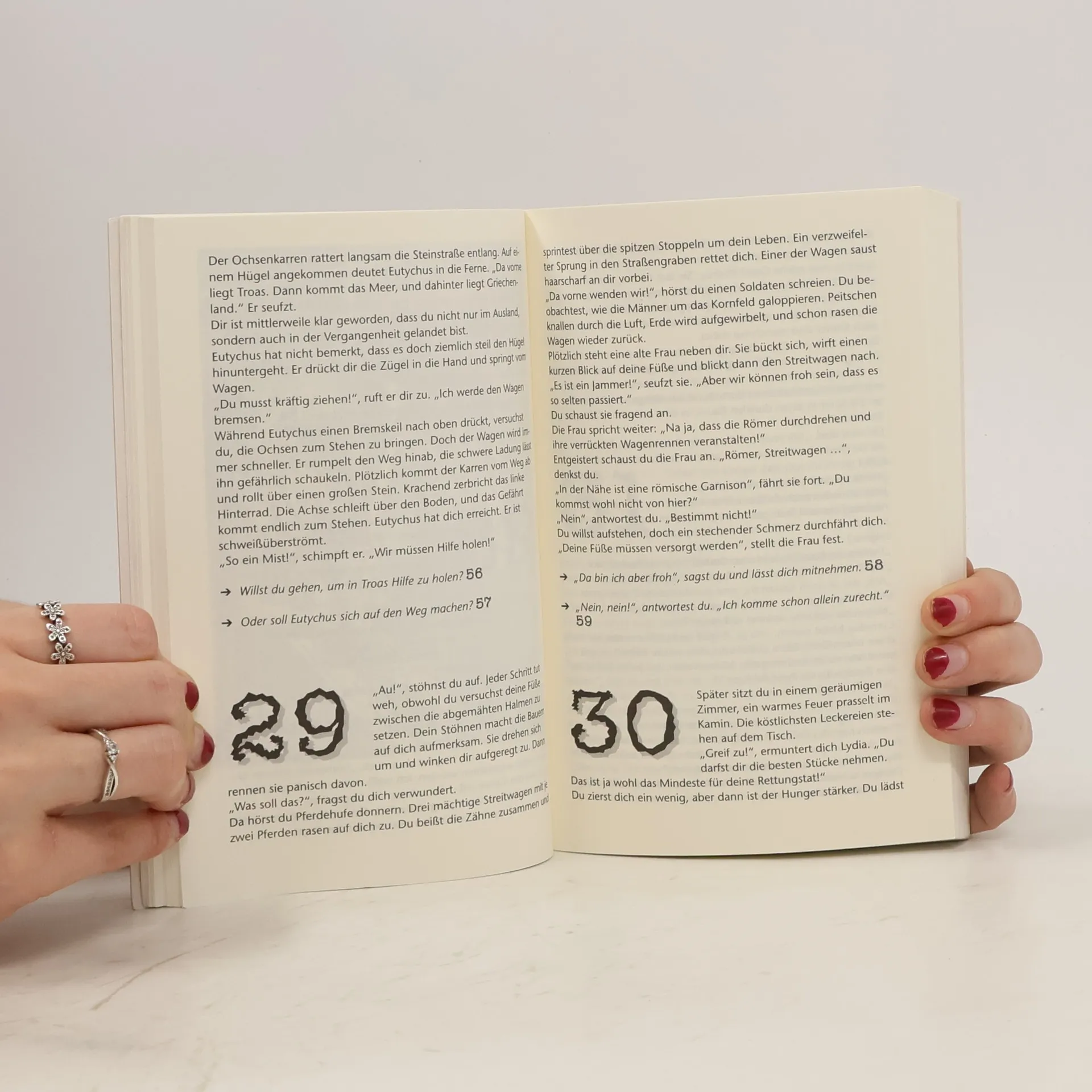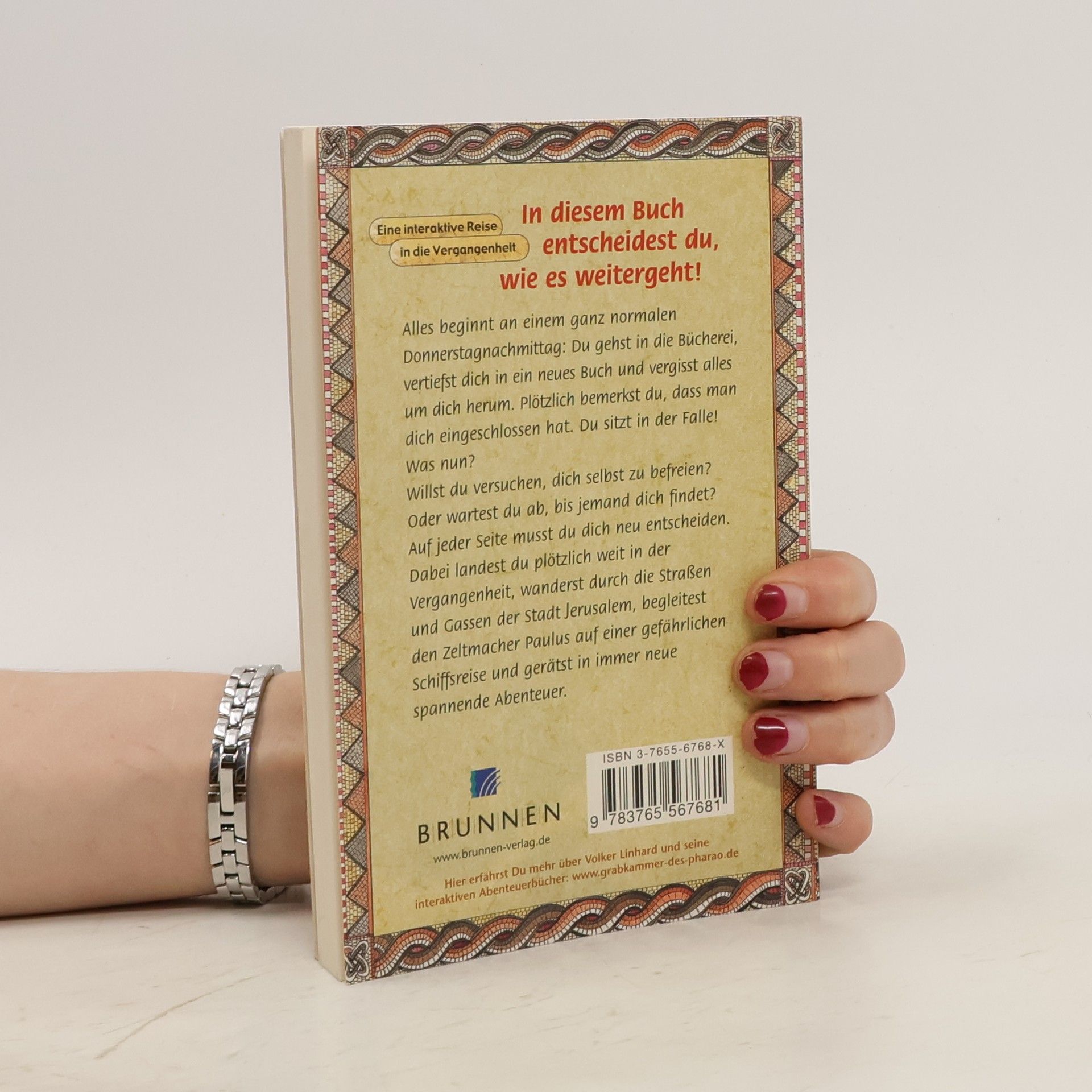 In diesem interaktiven Buch entscheiden die Leser, wie die Geschichte weitergeht. Nach dem Einschluss in einer Bücherei wählt man zwischen Selbstbefreiung oder Warten. Die Reise führt durch verschiedene Abenteuer, darunter historische Erlebnisse in Jerusalem und eine gefährliche Schiffsreise.