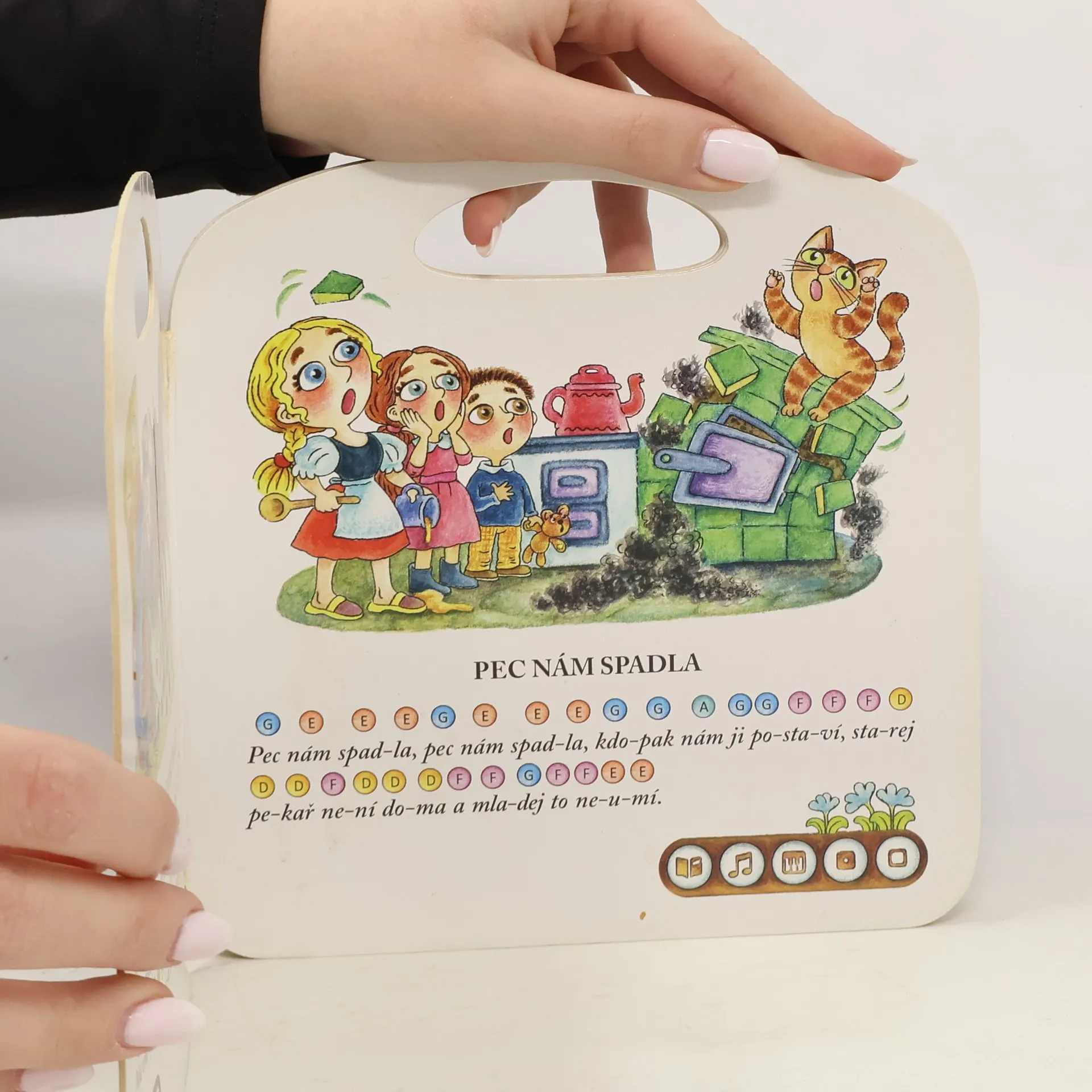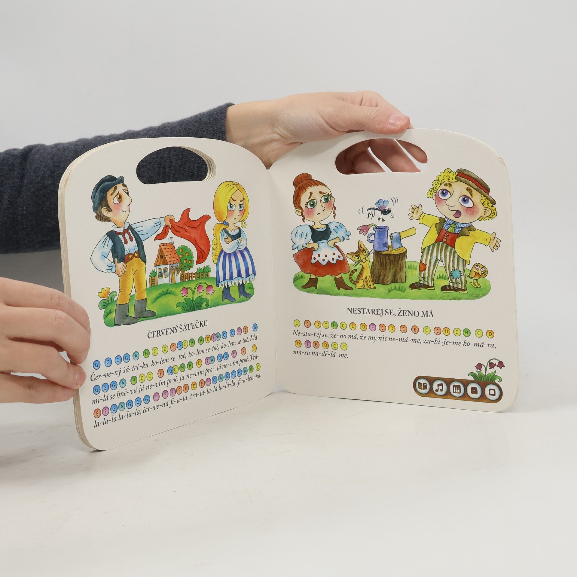 Kniha obsahuje dvanáct lidových písniček včetně barevných not, které si děti mohou samy přehrát pomocí Kouzelného piána. Zahrají si známe písničky jako Jede, jede poštovský panáček, Pec nám spadla, Já mám koně, Černé oči, Červený šátečku, Holka modrooká, Skákal pes a další.