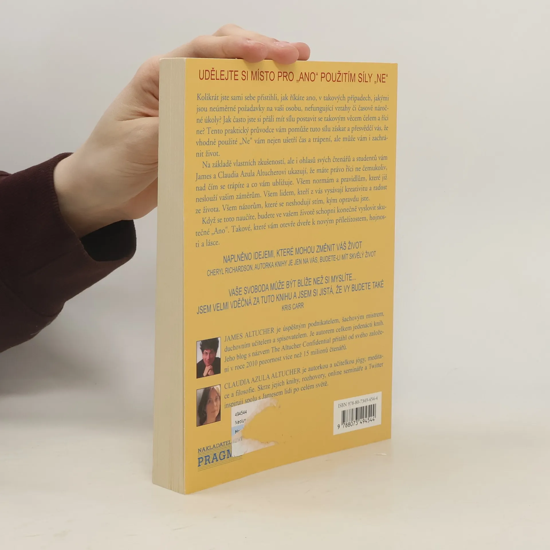 Potřeboval/a bych, abys... !“ „Mohl/a bys, prosím, ještě...?“ „Dnes tady musíte zůstat přesčas!“ A tak dále. A tak podobně. Kdo by se aspoň někdy nepřistihl, jak přes sevřené rty v podobných situacích cedí: „ANO,“ zatímco ve skrytu touží reagovat rázným a jednoznačným: „NE!“ Pokud jste v sobě tuto sílu dosud nenalezli, nezoufejte. Předkládaná kniha právě přichází, aby vám ukázala cestu, jak si toto slůvko osvojit a otevřít se tak vyslovení nového ANO, které přitaká přesně takovému životu, jejž chce vaše pravé já prožít. Nechte se inspirovat skutečnými příběhy ze života Jamese a Claudie Azuly Altucherových i pozitivní zpětnou vazbou, kterou získali od svých čtenářů a účastníků seminářů, a už nikdy nebudete litovat, až se zase uslyšíte říkat: „ANO!“