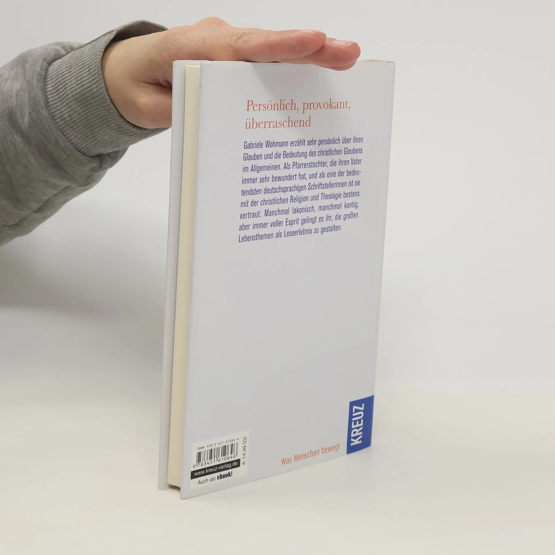 Gabriele Wohmann teilt persönlich ihren Glauben und die Bedeutung des Christentums. Als Pfarrerstochter und bedeutende Schriftstellerin bringt sie ihre fundierte Kenntnis der Religion ein. Mit lakonischem und espritvollem Stil gestaltet sie große Lebensthemen als fesselndes Leseerlebnis.