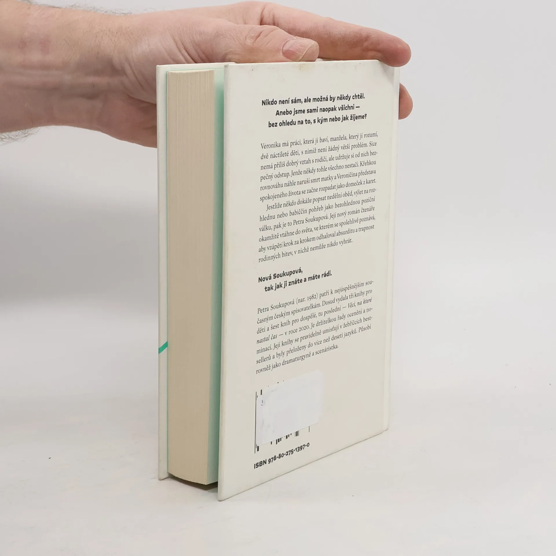 Nikdo není sám, ale možná by někdy chtěl. Anebo jsme sami naopak všichni — bez ohledu na to, s kým nebo jak žijeme?Veronika má práci, která ji baví, manžela, který jí rozumí, dvě náctileté děti, s nimiž není žádný větší problém. Sice nemá příliš dobrý vztah s rodiči, ale udržuje si od nich bezpečný odstup. Jenže někdy tohle všechno nestačí. Křehkou rovnováhu náhle naruší smrt matky a Veroničina představa spokojeného života se začne rozpadat jako domeček z karet.Jestliže někdo dokáže popsat nedělní oběd, výlet na rozhlednu nebo babiččin pohřeb jako bezohlednou poziční válku, pak je to Petra Soukupová. Její nový román čtenáře okamžitě vtáhne do světa, ve kterém se spolehlivě poznává, aby vzápětí krok za krokem odhaloval absurditu a trapnost rodinných bitev, v nichž nemůže nikdo vyhrát.Nová Soukupová, tak jak ji znáte a máte rádi.
