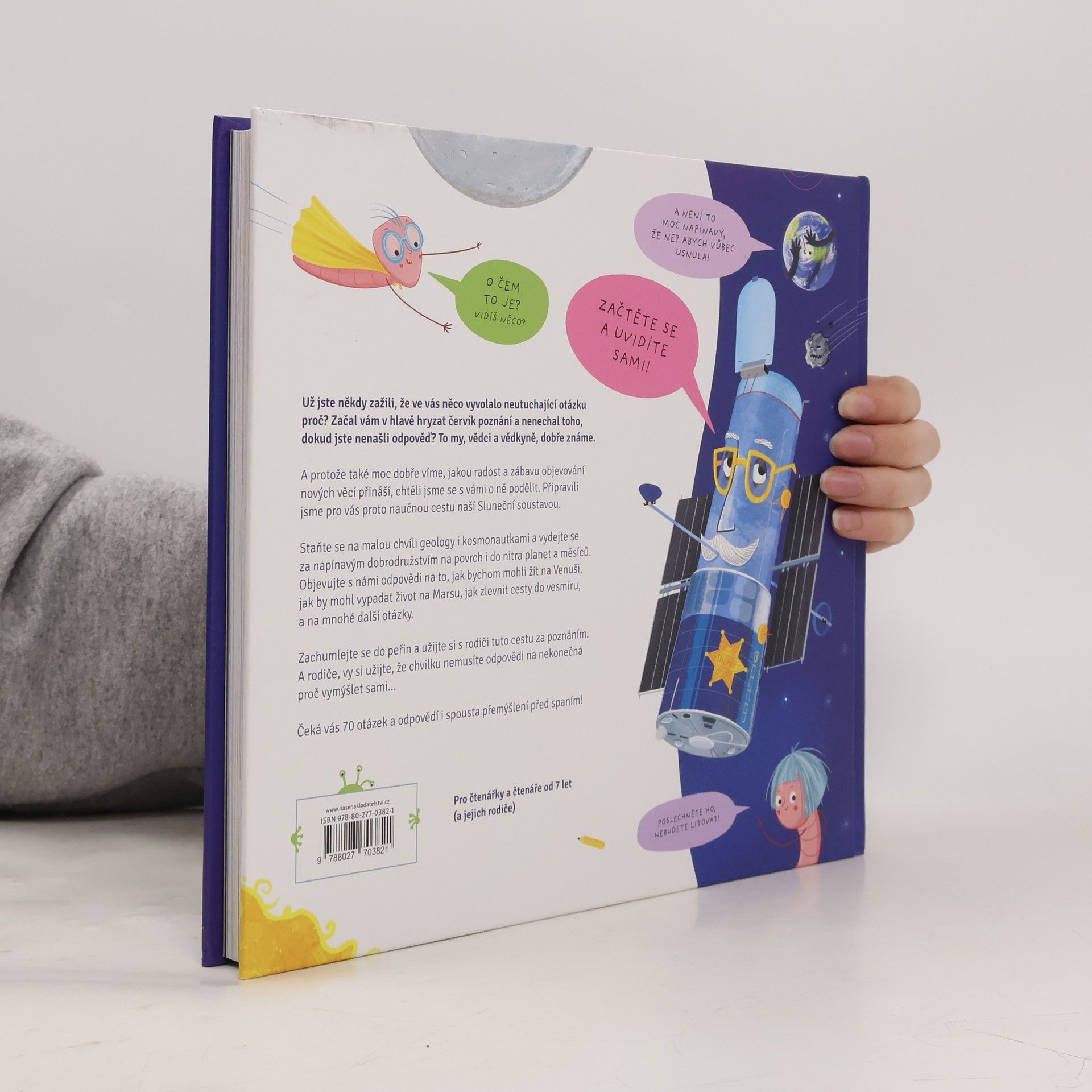 Už jste někdy zažili, že ve vás něco vyvolalo neodbytnou otázku proč? Začal vám v hlavě hryzat červík poznání a nenechal toho, dokud jste nenašli odpověď? To my, vědci a vědkyně, dobře známe.A protože také moc dobře víme, jakou radost a zábavu objevování nových věcí přináší, chtěli jsme se s vámi o ně podělit. Připravili jsme pro vás proto naučnou cestu naší Sluneční soustavou.Staňte se na malou chvíli geology i kosmonautkami a vydejte se za napínavým dobrodružstvím na povrch i do nitra planet a měsíců. Objevujte s námi odpovědi na to, jak bychom mohli žít na Venuši, jak by mohl vypadat život na Marsu, jak zlevnit cesty do vesmíru a na mnohé další otázky.Zachumlejte se pod peřinu a užijte si s rodiči tuto cestu za poznáním. A rodiče, vy si užijte, že chvilku nemusíte odpovědi na nekonečná proč vymýšlet sami...Čeká vás 70 otázek a odpovědí i spousta přemýšlení před spaním!