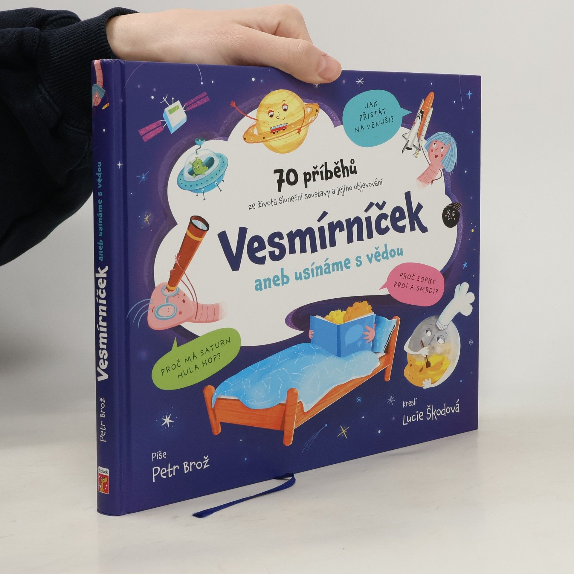 Už jste někdy zažili, že ve vás něco vyvolalo neodbytnou otázku proč? Začal vám v hlavě hryzat červík poznání a nenechal toho, dokud jste nenašli odpověď? To my, vědci a vědkyně, dobře známe.A protože také moc dobře víme, jakou radost a zábavu objevování nových věcí přináší, chtěli jsme se s vámi o ně podělit. Připravili jsme pro vás proto naučnou cestu naší Sluneční soustavou.Staňte se na malou chvíli geology i kosmonautkami a vydejte se za napínavým dobrodružstvím na povrch i do nitra planet a měsíců. Objevujte s námi odpovědi na to, jak bychom mohli žít na Venuši, jak by mohl vypadat život na Marsu, jak zlevnit cesty do vesmíru a na mnohé další otázky.Zachumlejte se pod peřinu a užijte si s rodiči tuto cestu za poznáním. A rodiče, vy si užijte, že chvilku nemusíte odpovědi na nekonečná proč vymýšlet sami...Čeká vás 70 otázek a odpovědí i spousta přemýšlení před spaním!