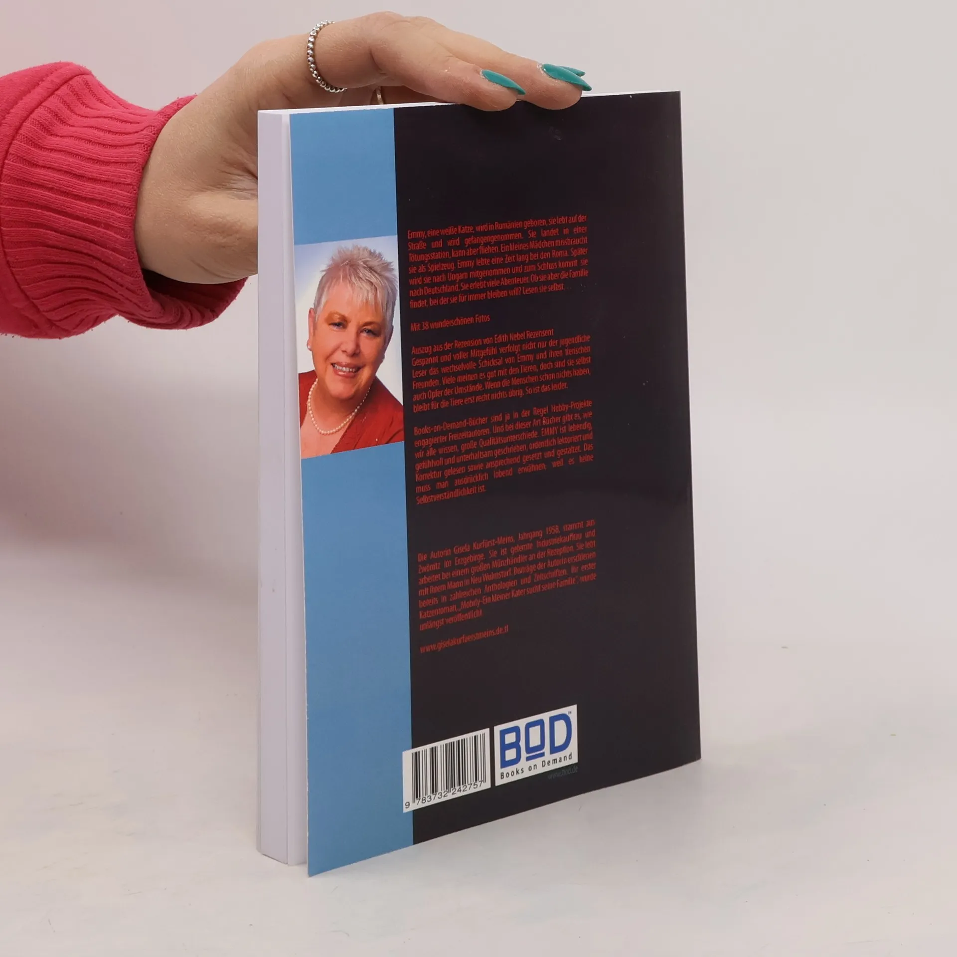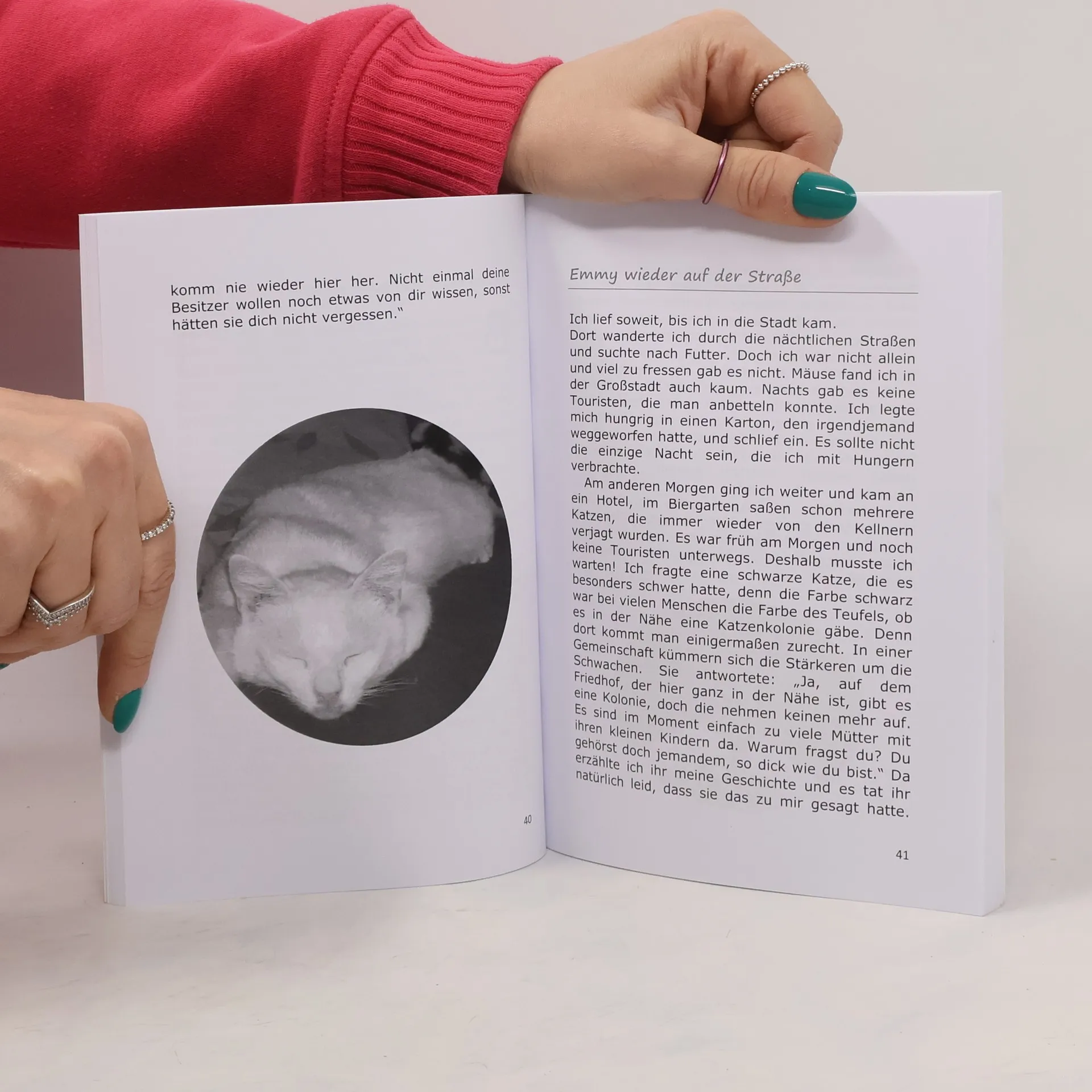 Emmy, eine weiße Katze, wird in Rumänien geboren, erlebt Missbrauch und Flucht aus einer Tötungsstation, lebt bei Roma und reist nach Ungarn und Deutschland. Ihre Abenteuer und die Suche nach einer Familie werden spannend erzählt. Das Buch ist lebendig und gut gestaltet, mit 38 schönen Fotos.