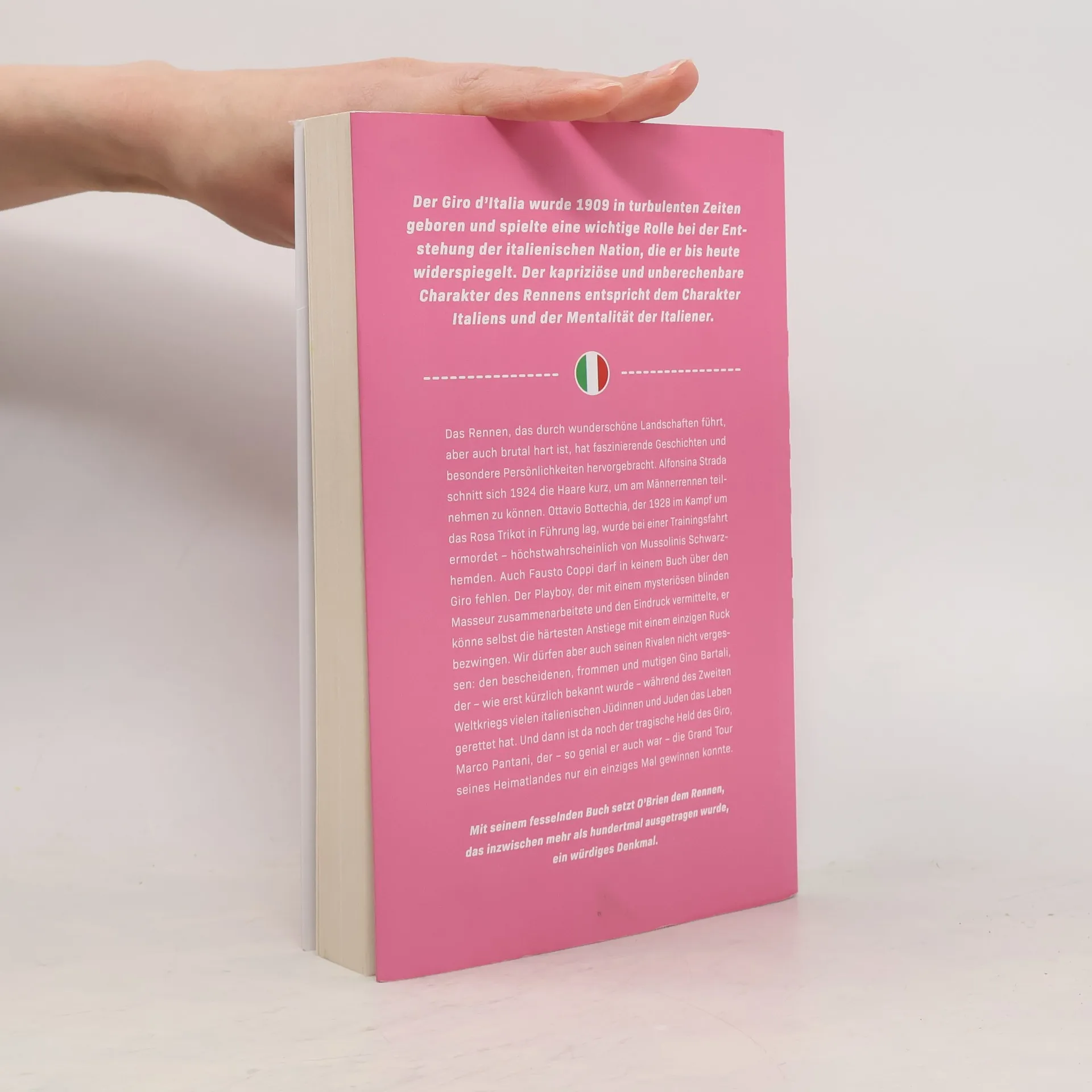 Der Giro d'Italia, 1909 gegründet, spiegelt die leidenschaftliche und extreme Natur Italiens wider. Das Rennen hat prägende Figuren hervorgebracht, wie Alfonsina Strada, Ottavio Bottecchia und Fausto Coppi, deren Geschichten die kulturellen Veränderungen des Landes darstellen. Die hundertste Ausgabe 2017 wird in diesem Buch gefeiert.
