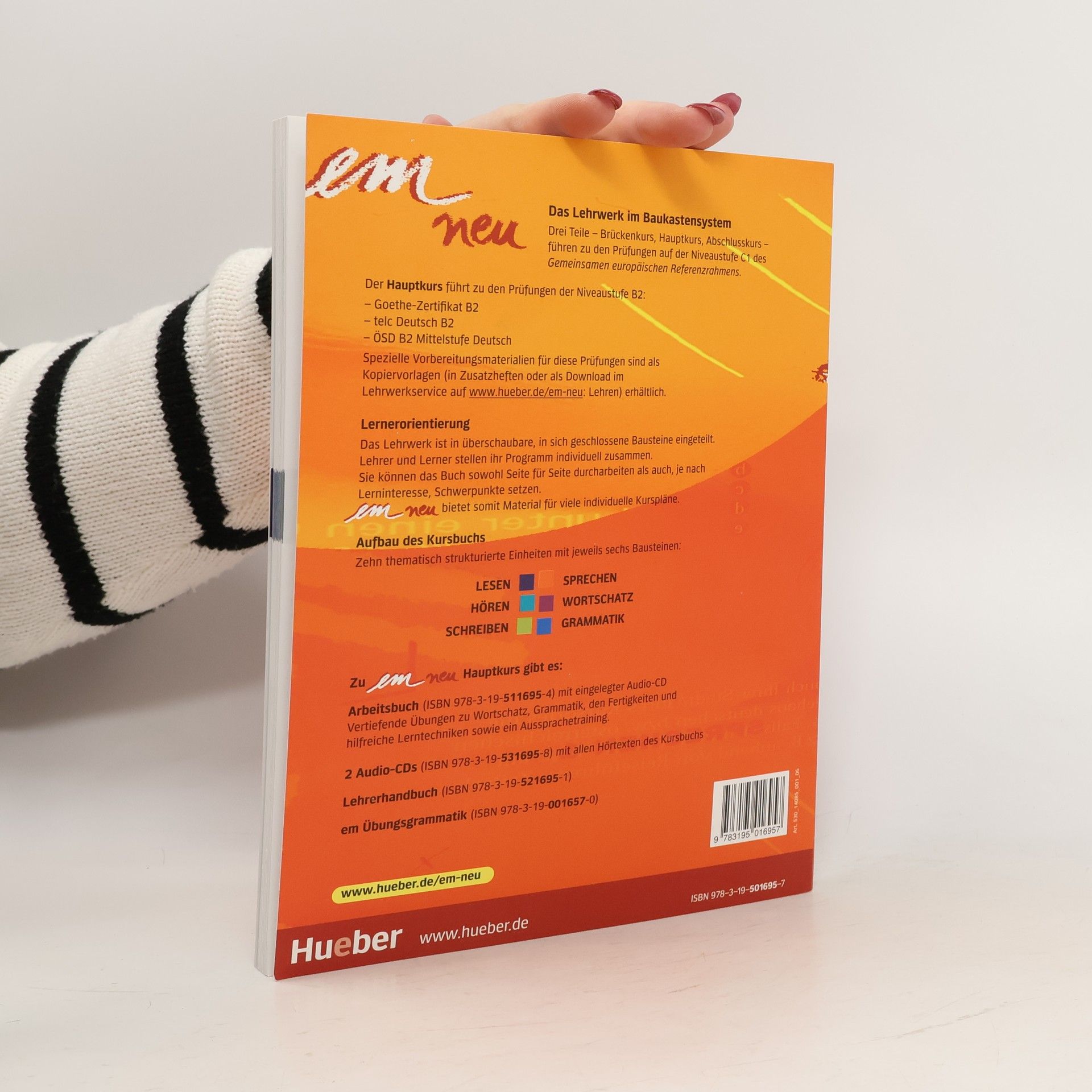 Voraussetzung: em neu Hauptkurs ist für Lernende, die die Grundstufe erfolgreich abgeschlossen haben. Lernziel: Sprachbeherrschung auf der Niveaustufe B2. Zur Vorbereitung auf die entsprechenden Prüfungen von Goethe-Institut, telc und ÖSDgibt es kostenlose Zusatzhefte bzw.