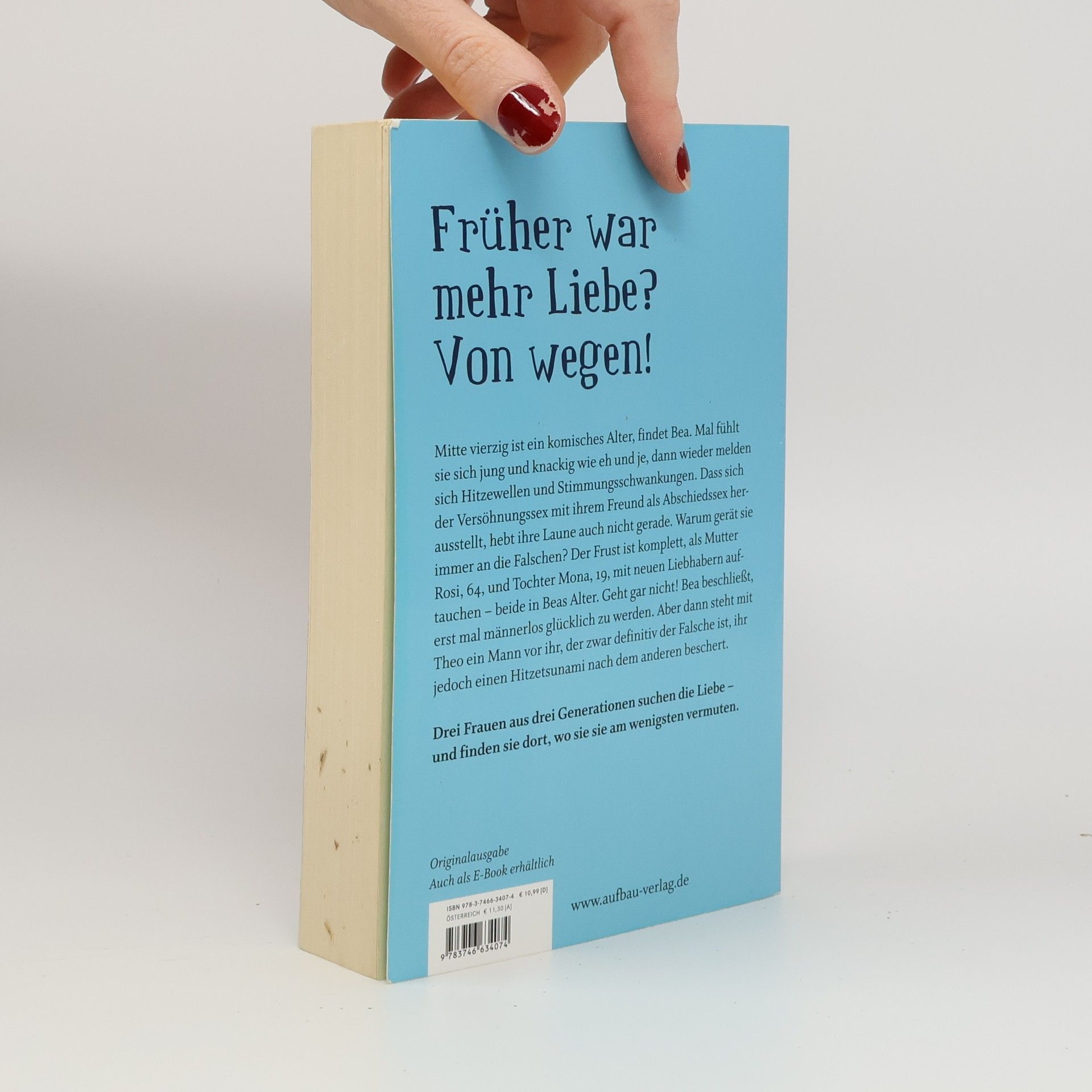 Früher war mehr Liebe? Von wegen! Mitte vierzig ist ein komisches Alter, findet Bea. Mal fühlt sie sich jung und knackig wie eh und je, dann wieder melden sich Hitzewellen und Stimmungsschwankungen. Dass sich der Versöhnungssex mit ihrem Freund als Abschiedssex herausstellt, hebt ihre Laune auch nicht gerade. Warum gerät sie immer an die Falschen? Der Frust ist komplett, als Mutter Rosi, 64, und Tochter Mona, 19, mit neuen Liebhabern auftauchen – beide in Beas Alter. Geht gar nicht! Bea beschließt, erst mal männerlos glücklich zu werden. Aber dann steht mit Theo ein Mann vor ihr, der zwar definitiv der Falsche ist, ihr jedoch einen Hitzetsunami nach dem anderen beschert. Drei Frauen aus drei Generationen suchen die Liebe – und finden sie dort, wo sie sie am wenigsten vermuten.