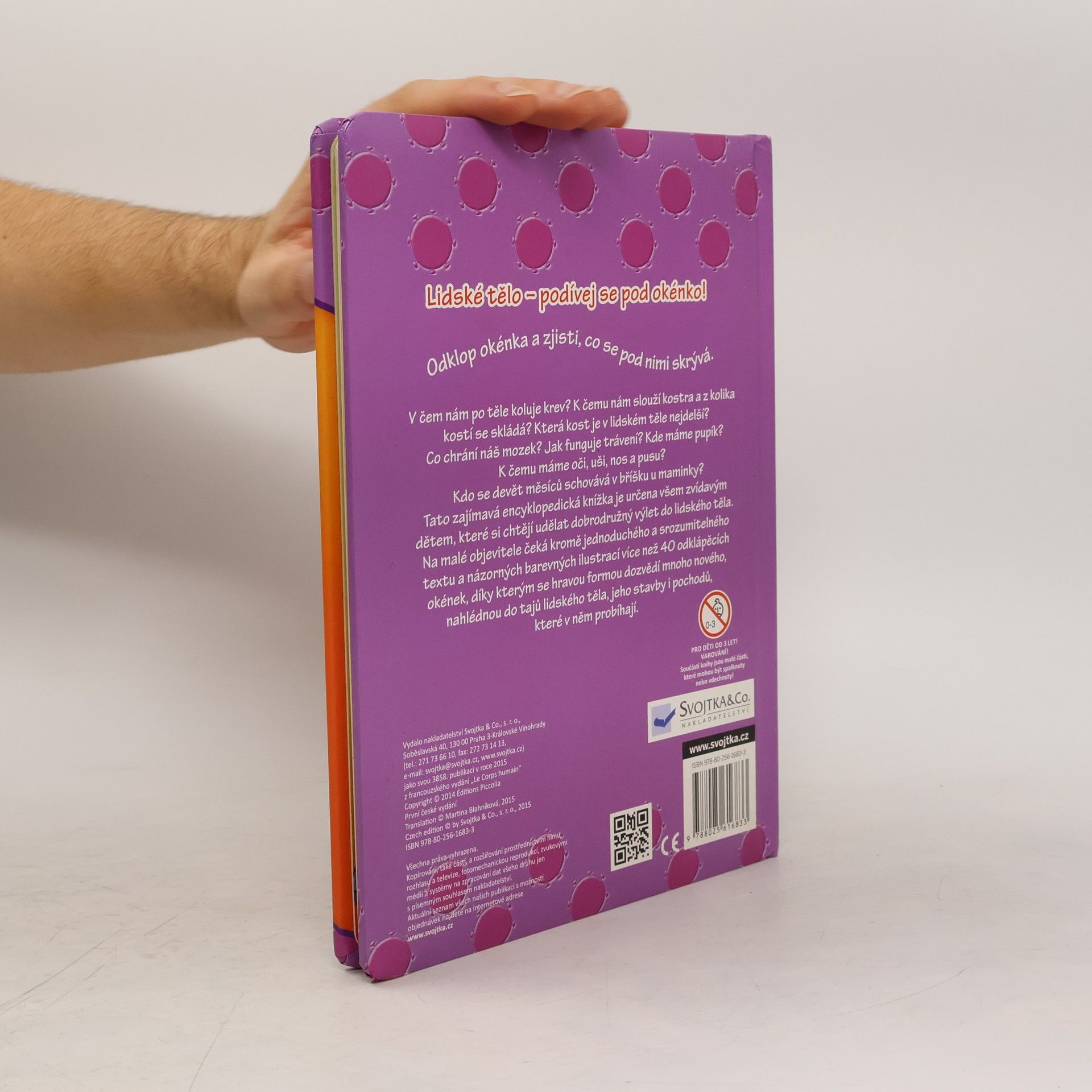 V čem nám po těle koluje krev? K čemu nám slouží kostra a z kolika kostí se skládá? Která kost je v lidském těle nejdelší? Co chrání náš mozek? Jak funguje trávení? Kdo se devět měsíců schovává v bříšku u maminky? Tato zajímavá encyklopedická knížka je určena všem zvídavým dětem, které si chtějí udělat dobrodružný výlet do lidského těla. Na malé objevitele čeká kromě jednoduchého a srozumitelného textu a názorných barevných ilustrací více než 40 odklápěcích okének, díky kterým se hravou formou dozvědí mnoho nového a nahlédnou do tajů lidského těla, jeho stavby i pochodů, které v něm probíhají.