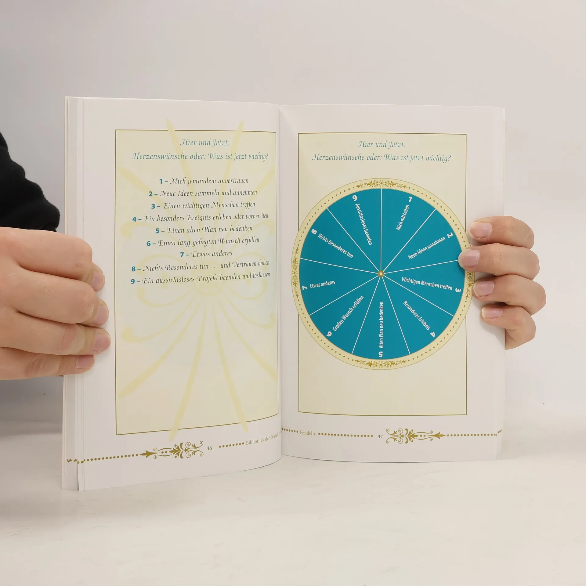 Dieses Set für Anfänger und Fortgeschrittene enthält ein farbig illustriertes Buch und ein Messingpendel in Tropfenform. Beides ist in einer dekorativen Box mit Goldfoliendruck verpackt. Es gehört zur Reihe "Bibliothek der Orakel", die 2011 mit mehreren Bänden startet.