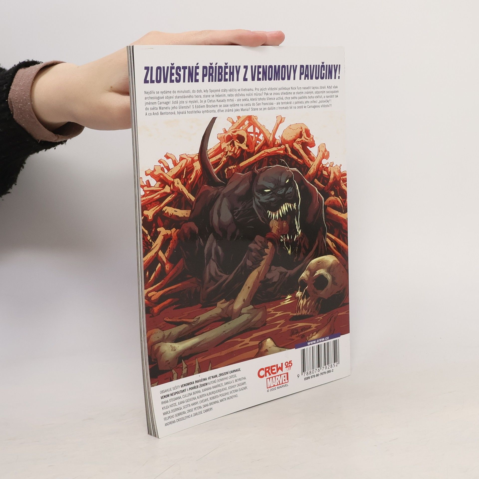 ZLOVĚSTNÉ PŘÍBĚHY Z VENOMOVY PAVUČINY!Nejdřív se vydáme do minulosti, do dob, kdy Spojené státy válčily ve Vietnamu. Pro jejich vítězství potřebuje Nick Fury nasadit tajnou zbraň. Když však archeologové objeví starodávného tvora, stane se řešením, nebo obživlou noční můrou? Pak se znovu shledáme se starým známým, odporným sociopatem jménem Carnage! Jistě jste si mysleli, že je Cletus Kasady mrtvý – ale sekta, která tohoto šílence uctívá, chce svého padlého boha vzkřísit, a navrátit tak do světa Marvelu jeho šílenství! S Eddiem Brockem se zase vydáme na cestu do San Franciska – ale tentokrát z pohledu jeho zvířecí „polovičky“! A co Andi Bentonová, bývalá hostitelka symbionta, dříve známá jako Mania? Stane se jen dalším z hromady těl na cestě ke Carnageovu vítězství?!Obsahuje sešity Venomova pavučina: Ve’nam, Zrození Carnage, Venom nespoutaný a Pohřeb žehem autorů Donnyho Catese, Ryana Stegmana, Cullena Bunna, Juanana Ramíreze, Danila S. Beyrutha, Kylea Hotze, Juana Gedeona, Alberta Alburquerqueho, Joshuy Cassary, Marca Deeringa, Scotta Hanny, Livesaye, Roberta Poggiho, Victora Olazaby, Felipeho Sobreira, Crise Petera, Dana Browna, Matta Yackeyho, Andrewa Crossleyho a Carlose Cabrery.