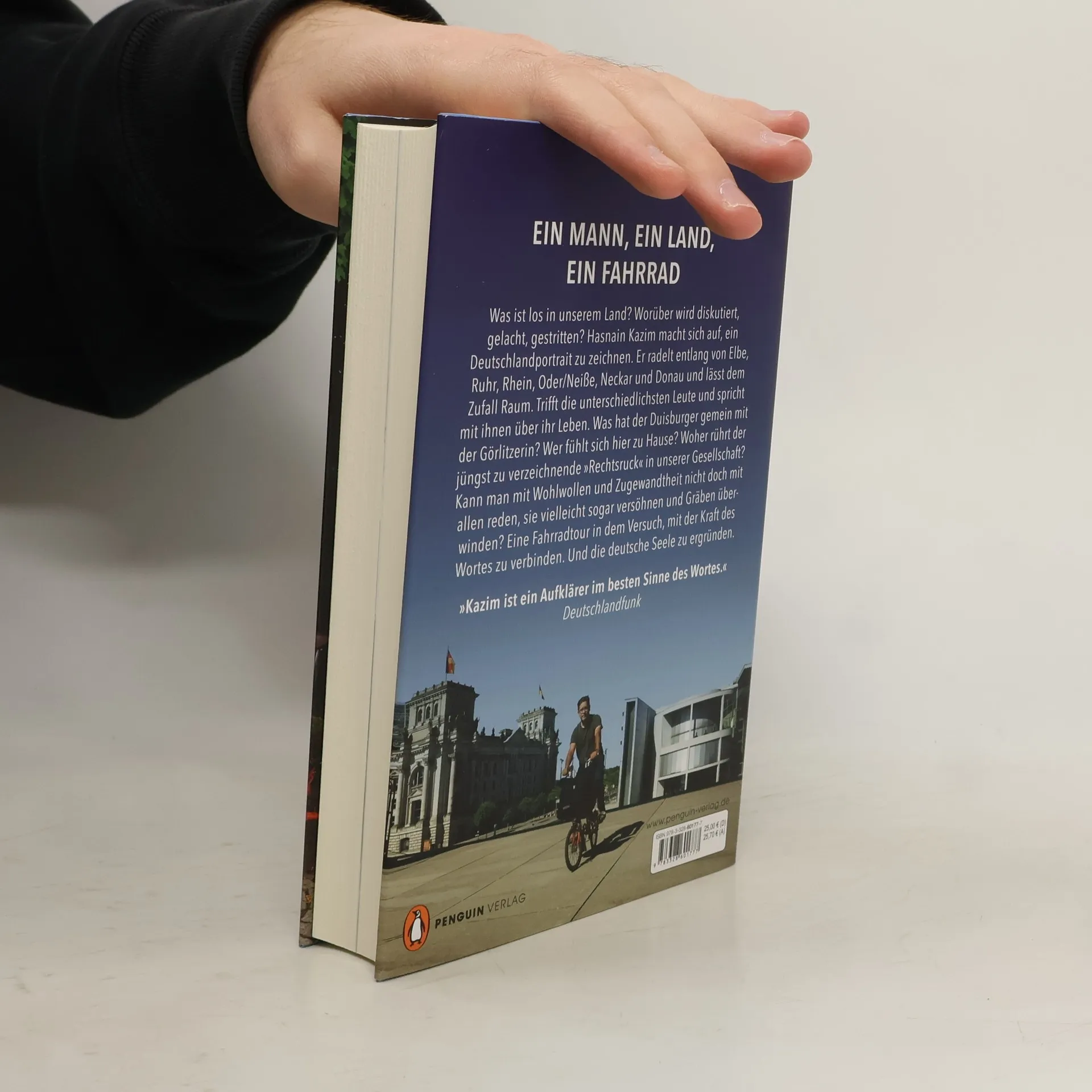 Hasnain Kazim erkundet Deutschland mit dem Fahrrad und zeichnet ein aktuelles Porträt des Landes. Er trifft verschiedene Menschen und diskutiert Themen wie Heimat, Diversität und Zugehörigkeit. Das Buch ist eine Selbstverortung und ein Versuch, durch Gespräche Gräben zu überwinden und die deutsche Seele zu verstehen.