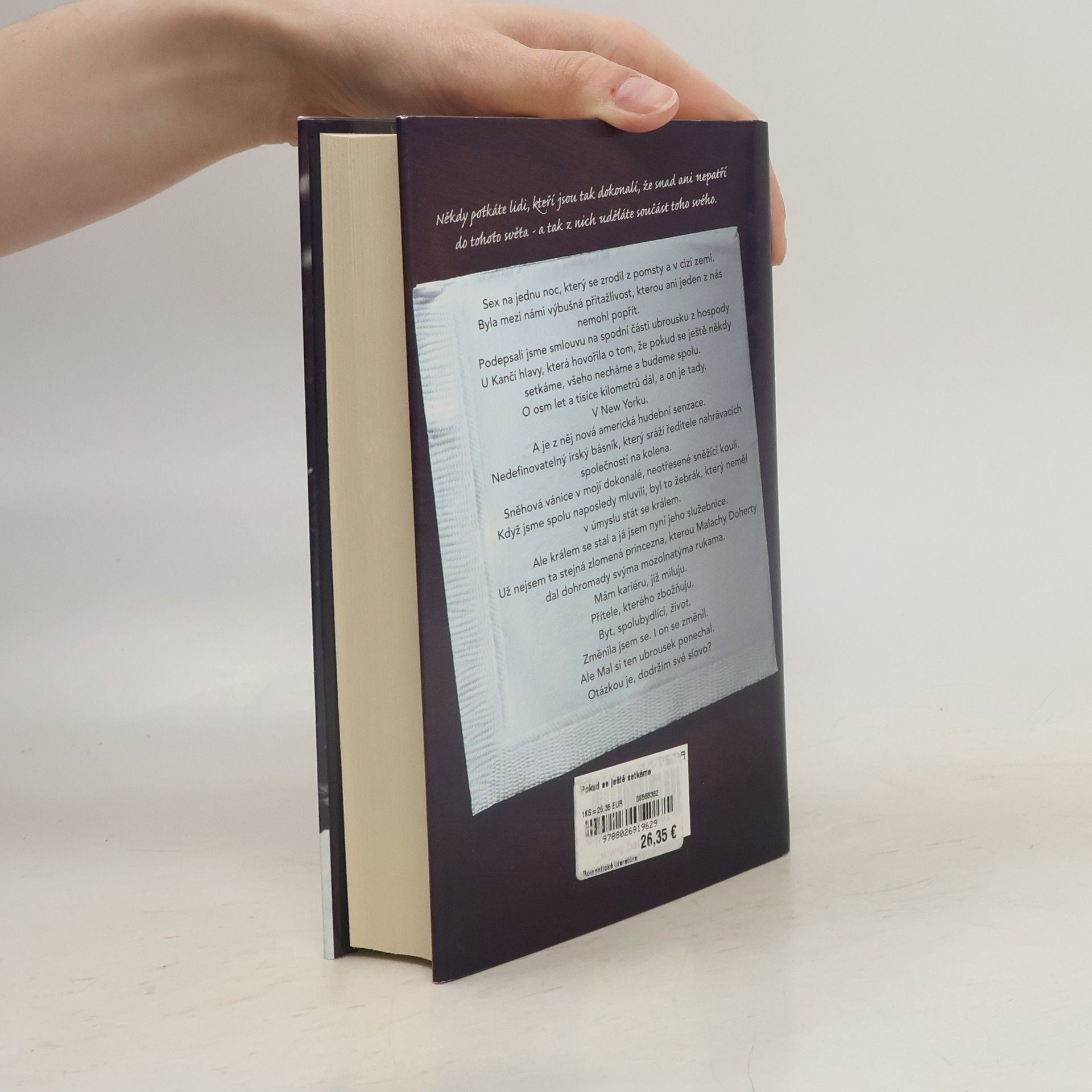 Sex na jednu noc, který se zrodil z pomsty a v cizí zemi. Byla mezi námi výbušná přitažlivost, kterou ani jeden z nás nemohl popřít. Podepsali jsme smlouvu na spodní části ubrousku hospody U Kančí hlavy, která hovořila o tom, že pokud se ještě někdy setkáme, všeho necháme a budeme spolu. O osm let a tisíce kilometrů dál, a on je tady. V New Yorku. A je z něj nová americká hudební senzace. Nedefinovatelný irský básník, který sráží ředitele nahrávacích společností na kolena. Sněhová vánice v mojí dokonalé, neotřesené sněhové kouli. Když jsme spolu naposledy mluvili, byl to žebrák, který neměl v úmyslu stát se králem. Ale králem se stal a já jsem nyní jeho služebnice. Už nejsem ta stejná zlomená princezna, kterou Malachy Doherty dal dohromady svýma mozolnatýma rukama. Mám kariéru, jíž miluju. Přítele, kterého zbožňuju. Byt, spolubydlící, život. Změnila jsem se. I on se změnil. Ale Mal si ten ubrousek ponechal. Otázkou je, dodržím své slovo?