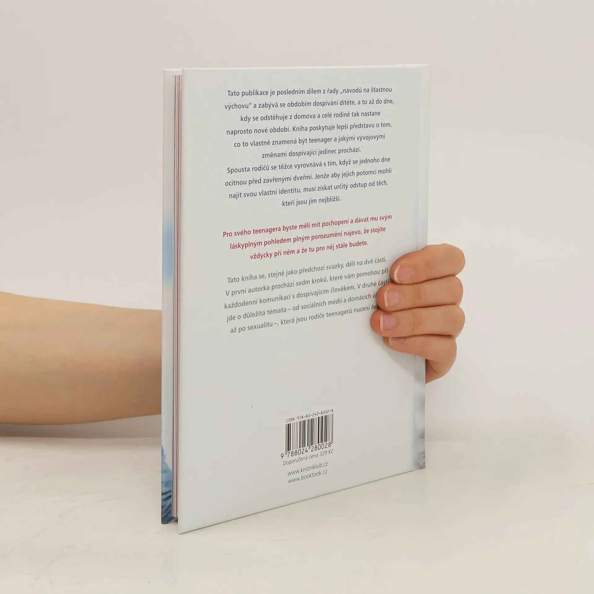 Tato publikace je pátým a posledním dílem velmi úspěšné série. Zabývá se obdobím dospívání vašeho dítěte, a to až do dne, kdy se odstěhuje a pro všechny členy rodiny tak začíná naprosto nová životní kapitola. Co to vlastně znamená, být teenager? Když porozumíte tomu, jaký je s tím spojený vývoj a změny, bude pro vás pak snazší se na výzvy tohoto období naladit. Spousta rodičů se těžce vyrovnává s tím, když se jednoho dne ocitnou před zavřenými dveřmi. Jenže abyste mohli najít svou vlastní identitu, potřebujete získat od těch, kteří jsou vám nejbližší, určitý odstup. Vaše dítě se od vás dokonce musí oddálit a vstoupit do širého světa.